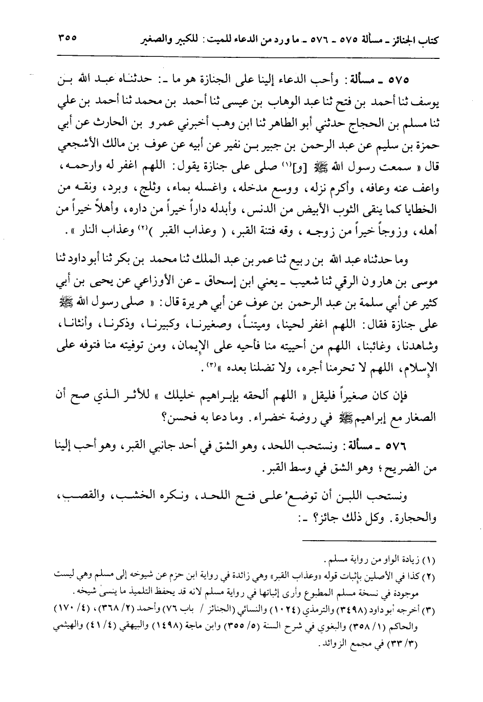 مَسْأَلَةٌ: وَأَحَبُّ الدُّعَاءِ إلَيْنَا عَلَى الْجِنَازَةِ هُوَ مَا -: حَدَّثَنَاهُ عَبْدُ اللَّهِ بْنُ يُوسُفَ ثنا أَحْمَدُ بْنُ فَتْحٍ ثنا عَبْدُ الْوَهَّابِ بْنُ عِيسَى ثنا أَحْمَدُ بْنُ مُحَمَّدٍ ثنا أَحْمَدُ بْنُ عَلِيٍّ ثنا مُسْلِمُ بْنُ الْحَجَّاجِ حَدَّثَنِي أَبُو الطَّاهِرِ ثنا ابْنُ وَهْبٍ أَخْبَرَنِي عَمْرُو بْنُ الْحَارِثِ عَنْ أَبِي حَمْزَةَ بْنِ سُلَيْمٍ عَنْ عَبْدِ الرَّحْمَنِ بْنِ جُبَيْرِ بْنِ نَفِيرٍ عَنْ أَبِيهِ عَنْ «عَوْفِ بْنِ مَالِكٍ الْأَشْجَعِيِّ قَالَ: سَمِعْتُ رَسُولَ اللَّهِ - صَلَّى اللَّهُ عَلَيْهِ وَسَلَّمَ - وَصَلَّى عَلَى جِنَازَةٍ يَقُولُ: اللَّهُمَّ اغْفِرْ لَهُ وَارْحَمْهُ، وَاعْفُ عَنْهُ وَعَافِهِ، وَأَكْرِمْ نُزُلَهُ، وَوَسِّعْ مُدْخَلَهُ، وَاغْسِلْهُ بِمَاءٍ، وَثَلْجٍ، وَبَرَدٍ، وَنَقِّهِ مِنْ الْخَطَايَا كَمَا يُنَقَّى الثَّوْبُ الْأَبْيَضُ مِنْ الدَّنَسِ، وَأَبْدِلْهُ دَارًا خَيْرًا مِنْ دَارِهِ، وَأَهْلًا خَيْرًا مِنْ أَهْلِهِ، وَزَوْجًا خَيْرًا مِنْ زَوْجِهِ، وَقِه فِتْنَةَ الْقَبْرِ، وَعَذَابَ الْقَبْرِ وَعَذَابَ النَّارِ» .