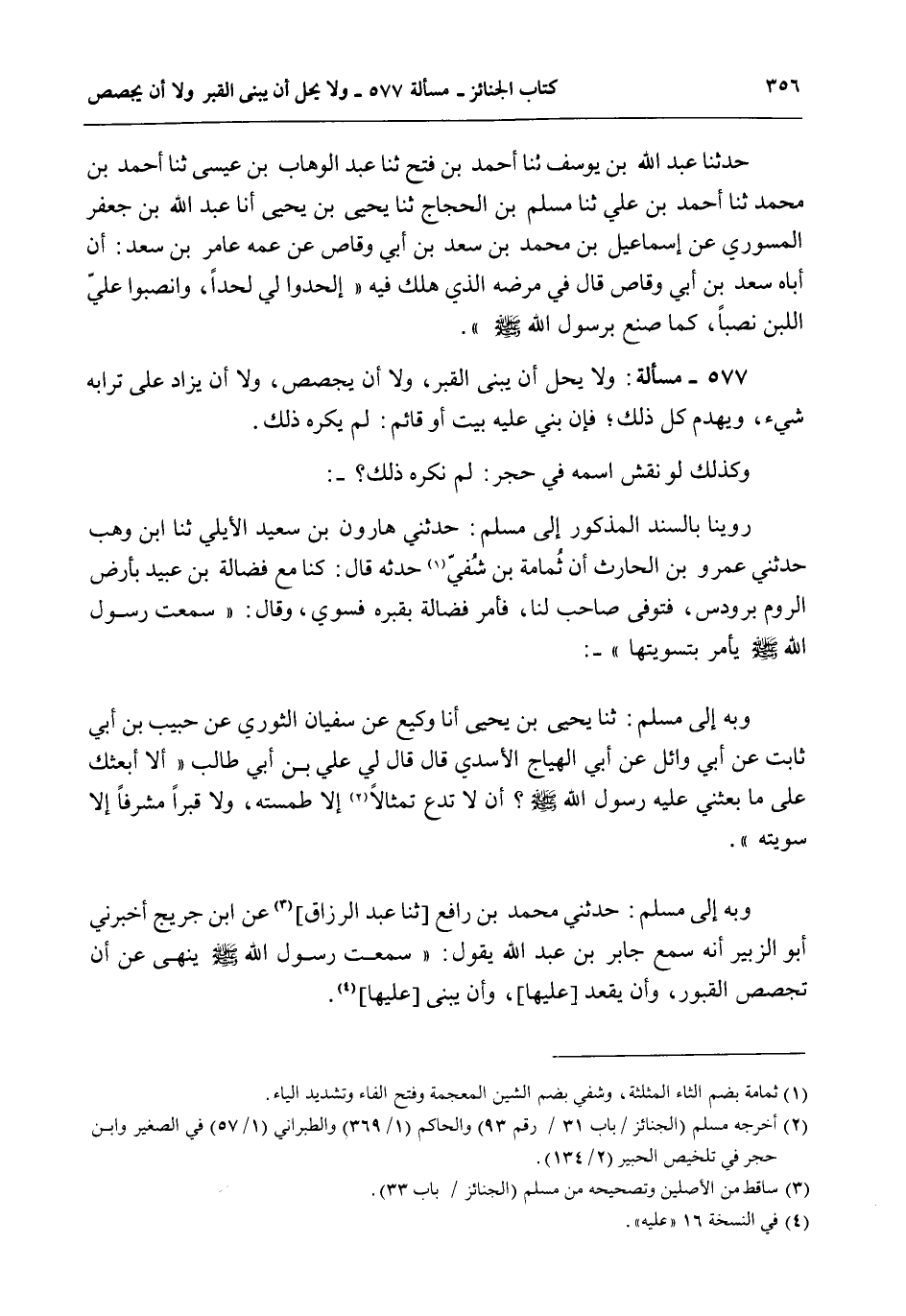 وَبِهِ إلَى مُسْلِمٍ: حَدَّثَنِي مُحَمَّدُ بْنُ رَافِعٍ [ثنا عَبْدُ الرَّزَّاقِ] عَنْ ابْنِ جُرَيْجٍ أَخْبَرَنِي أَبُو الزُّبَيْرِ أَنَّهُ سَمِعَ جَابِرَ بْنَ عَبْدِ اللَّهِ يَقُولُ: «سَمِعْتُ رَسُولَ اللَّهِ - صَلَّى اللَّهُ عَلَيْهِ وَسَلَّمَ - يَنْهَى عَنْ أَنْ تُجَصَّصَ الْقُبُورُ، وَأَنْ يُقْعَدَ عَلَيْهَا، وَأَنْ يُبْنَى عَلَيْهَا» .