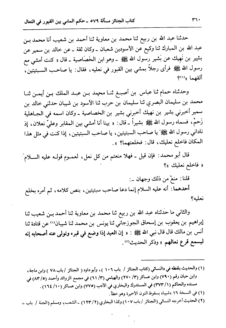 وَحَدَّثَنَاهُ حُمَامٌ ثنا عَبَّاسُ بْنُ أَصْبَغَ ثنا مُحَمَّدُ بْنُ عَبْدِ الْمَلِكِ بْنِ أَيْمَنَ ثنا مُحَمَّدُ بْنُ سُلَيْمَانَ الْبَصْرِيُّ ثنا سُلَيْمَانُ بْنُ حَرْبٍ ثنا الْأَسْوَدُ بْنُ شَيْبَانَ حَدَّثَنِي خَالِدُ بْنُ سَمِيرٍ أَخْبَرَنِي بَشِيرُ بْنُ نَهِيكٍ أَخْبَرَنِي بَشِيرُ بْنُ الْخَصَاصِيَةِ - وَكَانَ اسْمُهُ فِي الْجَاهِلِيَّةِ زَحْمٌ، فَسَمَّاهُ رَسُولُ اللَّهِ - صَلَّى اللَّهُ عَلَيْهِ وَسَلَّمَ - بَشِيرًا - قَالَ: «بَيْنَا أَنَا أَمْشِي بَيْنَ الْمَقَابِرِ وَعَلَيَّ نَعْلَانِ، إذْ نَادَانِي رَسُولُ اللَّهِ - صَلَّى اللَّهُ عَلَيْهِ وَسَلَّمَ - يَا صَاحِبَ السِّبْتِيَّتَيْنِ، يَا صَاحِبَ السِّبْتِيَّتَيْنِ، إذَا كُنْت فِي مِثْلِ هَذَا الْمَكَانِ فَاخْلَعْ نَعْلَيْكَ، قَالَ: فَخَلَعْتُهُمَا» ؟ .