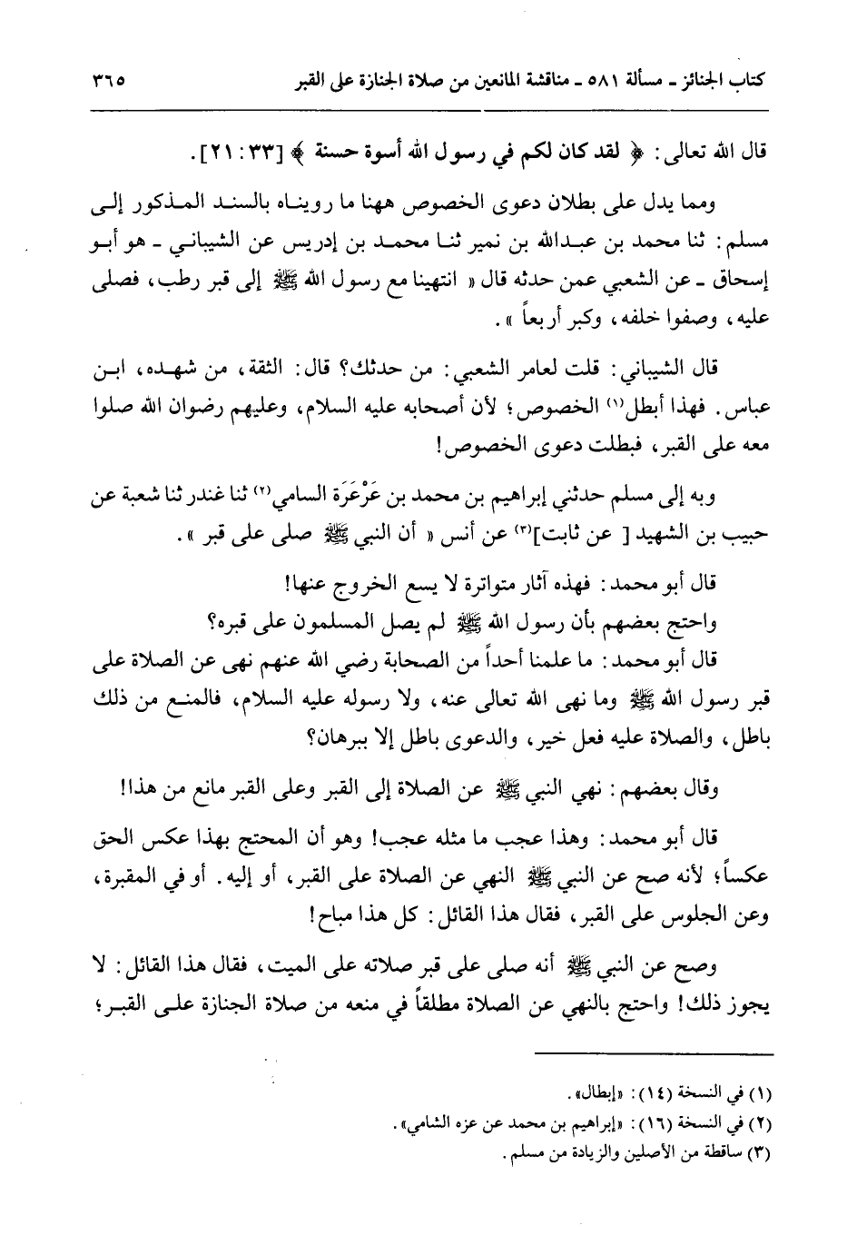 فَهَذَا أَبْطَلَ الْخُصُوصَ، لِأَنَّ أَصْحَابَهُ - عَلَيْهِ السَّلَامُ -، وَعَلَيْهِمْ رِضْوَانُ اللَّهِ صَلَّوْا مَعَهُ عَلَى الْقَبْرِ، فَبَطَلَتْ دَعْوَى الْخُصُوصِ