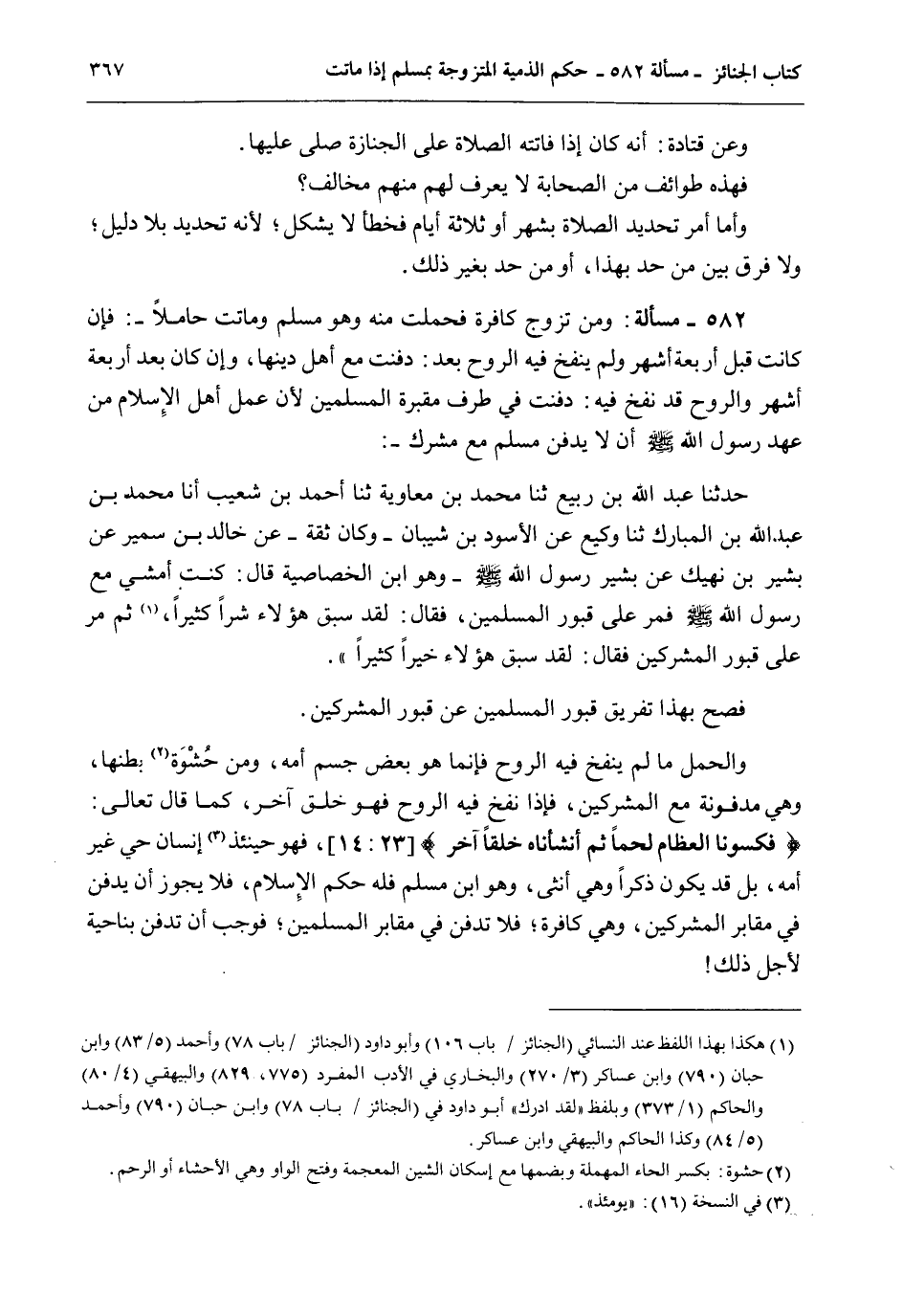 582 - مَسْأَلَةٌ: وَمَنْ تَزَوَّجَ كَافِرَةً فَحَمَلَتْ مِنْهُ وَهُوَ مُسْلِمٌ وَمَاتَتْ حَامِلًا -: فَإِنْ كَانَتْ قَبْلَ أَرْبَعَةِ أَشْهُرٍ وَلَمْ يُنْفَخْ فِيهِ الرُّوحُ بَعْدُ: دُفِنَتْ مَعَ أَهْلِ دِينِهَا، وَإِنْ كَانَ بَعْدَ أَرْبَعَةِ أَشْهُرٍ وَالرُّوحُ قَدْ نُفِخَ فِيهِ: دُفِنَتْ فِي طَرَفِ مَقْبَرَةِ الْمُسْلِمِينَ؛ لِأَنَّ عَمَلَ أَهْلِ الْإِسْلَامِ مِنْ عَهْدِ رَسُولِ اللَّهِ - صَلَّى اللَّهُ عَلَيْهِ وَسَلَّمَ - أَنْ لَا يُدْفَنَ مُسْلِمٌ مَعَ مُشْرِكٍ -: حَدَّثَنَا عَبْدُ اللَّهِ بْنُ رَبِيعٍ ثنا مُحَمَّدُ بْنُ مُعَاوِيَةَ ثنا أَحْمَدُ بْنُ شُعَيْبٍ أَنَا مُحَمَّدُ بْنُ عَبْدِ اللَّهِ بْنِ الْمُبَارَكِ ثنا وَكِيعٌ عَنْ الْأَسْوَدِ بْنِ شَيْبَانَ - وَكَانَ ثِقَةً - عَنْ خَالِدِ بْنِ سَمِيرٍ عَنْ بَشِيرِ بْنِ نَهِيكٍ عَنْ بَشِيرِ رَسُولِ اللَّهِ - صَلَّى اللَّهُ عَلَيْهِ وَسَلَّمَ - وَهُوَ ابْنُ الْخَصَاصِيَةِ قَالَ: «كُنْتُ أَمْشِي مَعَ رَسُولِ اللَّهِ - صَلَّى اللَّهُ عَلَيْهِ وَسَلَّمَ - فَمَرَّ عَلَى قُبُورِ الْمُسْلِمِينَ، فَقَالَ: لَقَدْ سَبَقَ هَؤُلَاءِ شَرًّا كَثِيرًا، ثُمَّ مَرَّ عَلَى قُبُورِ الْمُشْرِكِينَ فَقَالَ: لَقَدْ سَبَقَ هَؤُلَاءِ خَيْرًا كَثِيرًا» .