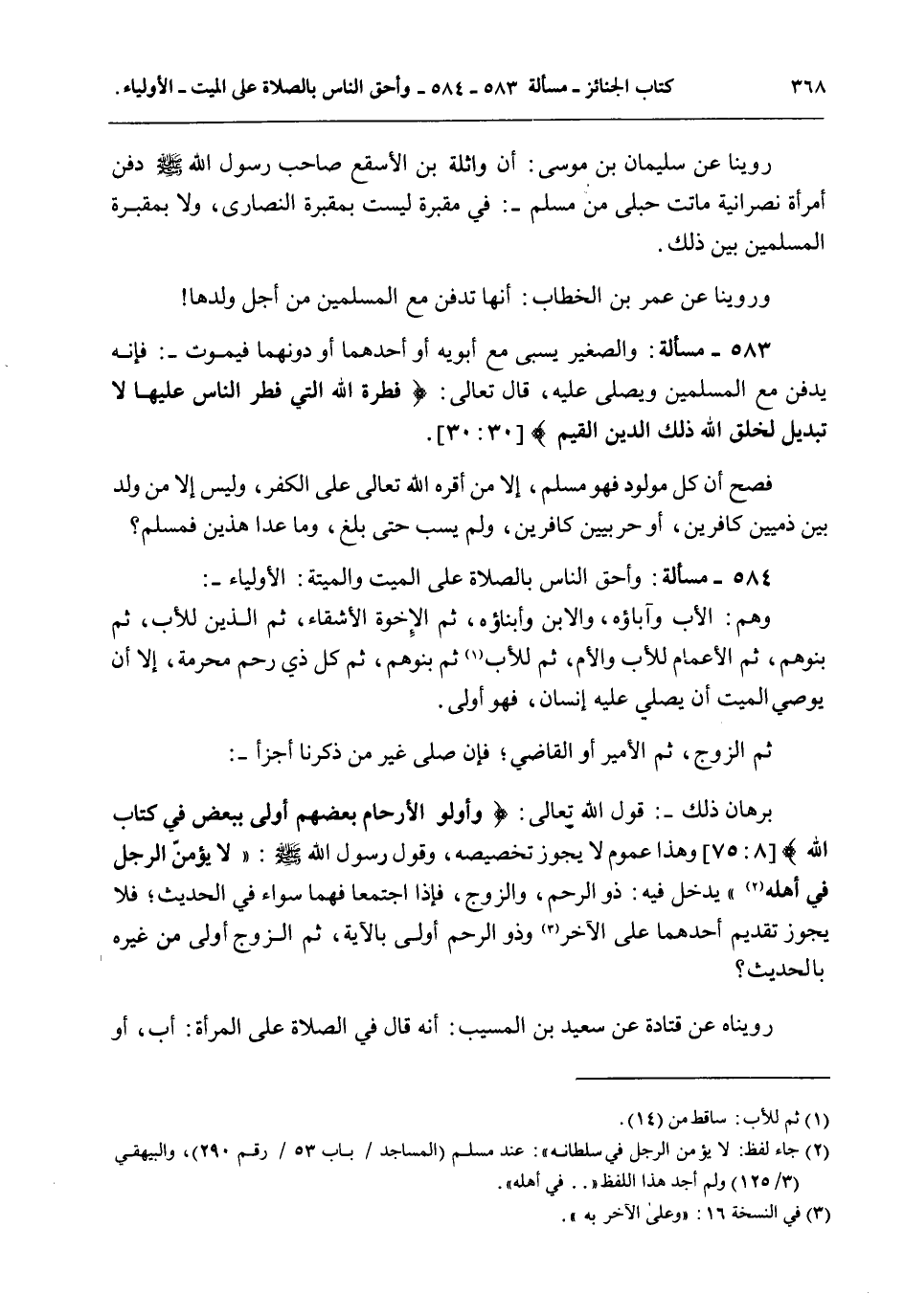 584 - مَسْأَلَةٌ: وَأَحَقُّ النَّاسِ بِالصَّلَاةِ عَلَى الْمَيِّتِ وَالْمَيِّتَةِ: الْأَوْلِيَاءُ -: وَهُمْ: الْأَبُ وَآبَاؤُهُ، وَالِابْنُ وَأَبْنَاؤُهُ، ثُمَّ الْإِخْوَةُ الْأَشِقَّاءُ، ثُمَّ الَّذِينَ لِلْأَبِ، ثُمَّ بَنُوهُمْ، ثُمَّ الْأَعْمَامُ لِلْأَبِ وَالْأُمِّ، ثُمَّ لِلْأَبِ ثُمَّ بَنُوهُمْ، ثُمَّ كُلُّ ذِي رَحِمٍ مَحْرَمَةٍ، إلَّا أَنْ يُوصِيَ الْمَيِّتُ أَنْ يُصَلِّيَ عَلَيْهِ إنْسَانٌ، فَهُوَ أَوْلَى.