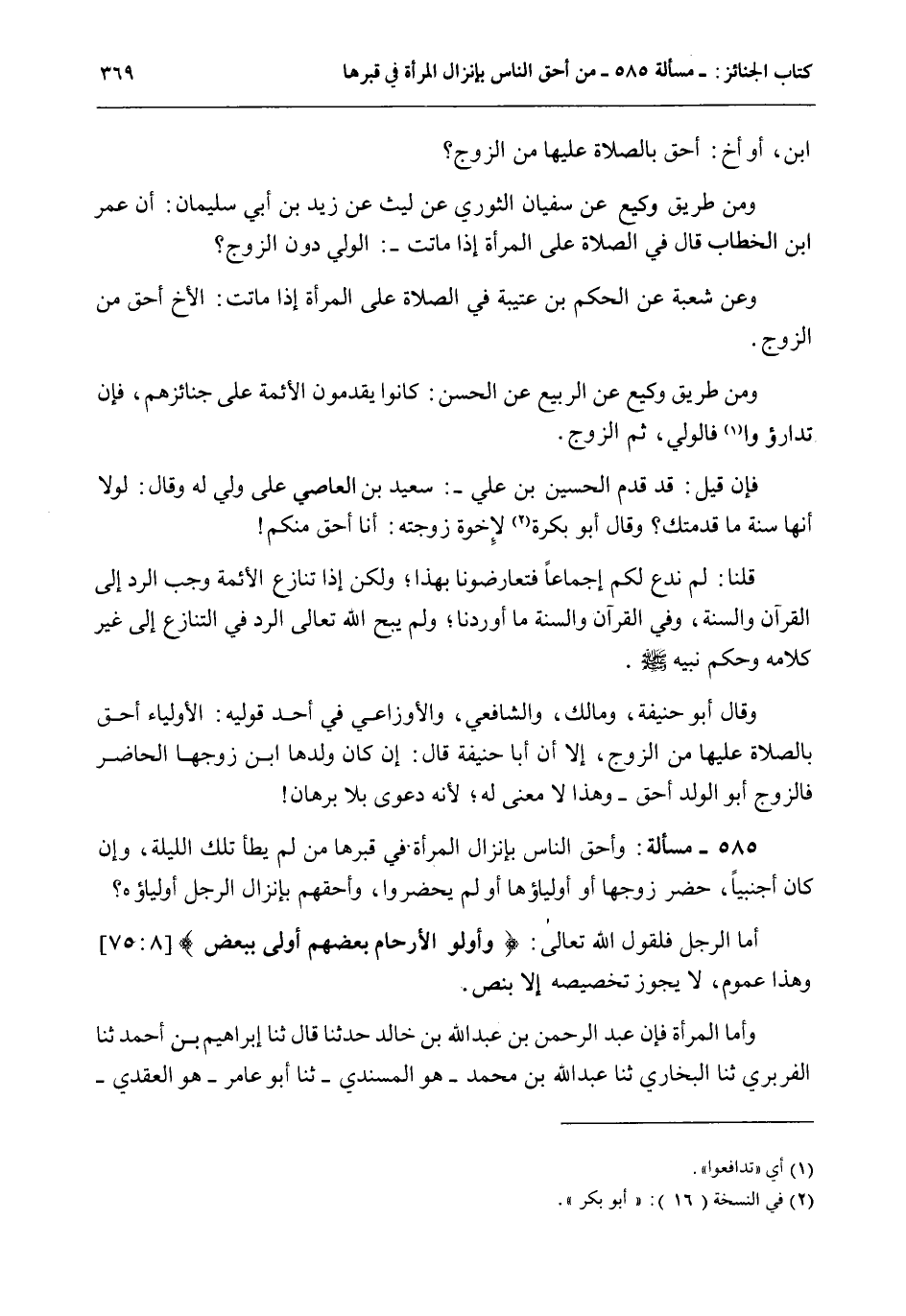 ابْنٌ، أَوْ أَخٌ: أَحَقُّ بِالصَّلَاةِ عَلَيْهَا مِنْ الزَّوْجِ؟ وَمِنْ طَرِيقِ وَكِيعٍ عَنْ سُفْيَانَ الثَّوْرِيِّ عَنْ لَيْثٍ عَنْ زَيْدِ بْنِ أَبِي سُلَيْمَانَ: أَنَّ عُمَرَ بْنَ الْخَطَّابِ قَالَ فِي الصَّلَاةِ عَلَى الْمَرْأَةِ إذَا مَاتَتْ -: الْوَلِيُّ دُونَ الزَّوْجِ؟ وَعَنْ شُعْبَةَ عَنْ الْحَكَمِ بْنِ عُتَيْبَةَ فِي الصَّلَاةِ عَلَى الْمَرْأَةِ إذَا مَاتَتْ: الْأَخُ أَحَقُّ مِنْ الزَّوْجِ.