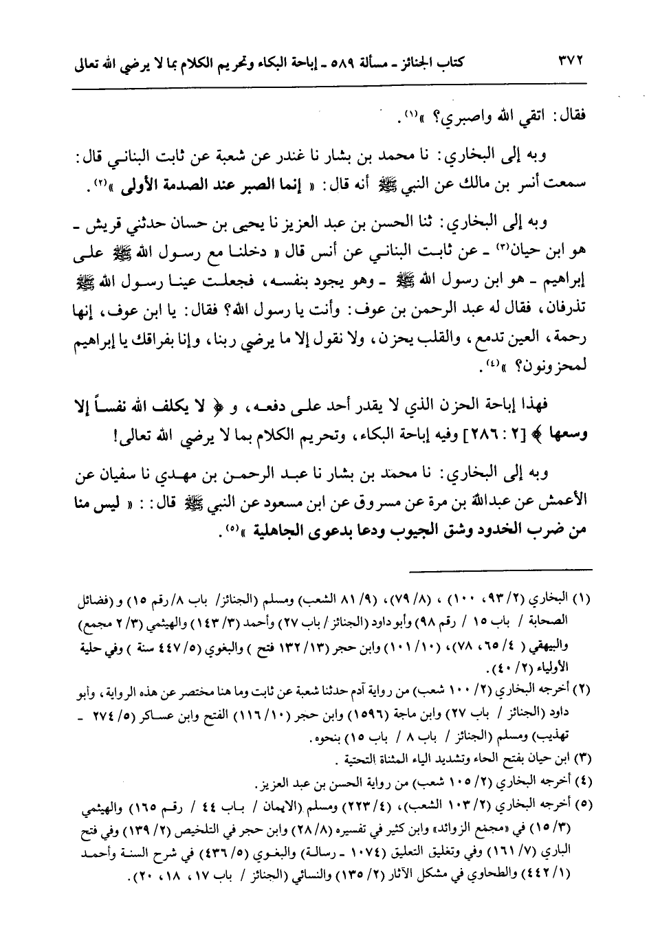 وَبِهِ إلَى الْبُخَارِيِّ: ثنا الْحَسَنُ بْنُ عَبْدِ الْعَزِيزِ نا يَحْيَى بْنُ حَسَّانَ حَدَّثَنِي قُرَيْشٌ هُوَ ابْنُ حَيَّانَ - عَنْ ثَابِتٍ الْبُنَانِيِّ عَنْ أَنَسٍ قَالَ «دَخَلْنَا مَعَ رَسُولِ اللَّهِ - صَلَّى اللَّهُ عَلَيْهِ وَسَلَّمَ - عَلَى إبْرَاهِيمَ - هُوَ ابْنُ رَسُولِ اللَّهِ - صَلَّى اللَّهُ عَلَيْهِ وَسَلَّمَ - وَهُوَ يَجُودُ بِنَفْسِهِ، فَجَعَلَتْ عَيْنَا رَسُولِ اللَّهِ - صَلَّى اللَّهُ عَلَيْهِ وَسَلَّمَ - تَذْرِفَانِ، فَقَالَ لَهُ عَبْدُ الرَّحْمَنِ بْنُ عَوْفٍ: وَأَنْتَ يَا رَسُولَ اللَّهِ؟ فَقَالَ: يَا ابْنَ عَوْفٍ، إنَّهَا رَحْمَةٌ، الْعَيْنُ تَدْمَعُ، وَالْقَلْبُ يَحْزَنُ، وَلَا نَقُولُ إلَّا مَا يُرْضِي رَبَّنَا، وَإِنَّا بِفِرَاقِك يَا إبْرَاهِيمُ لَمَحْزُونُونَ؟» .