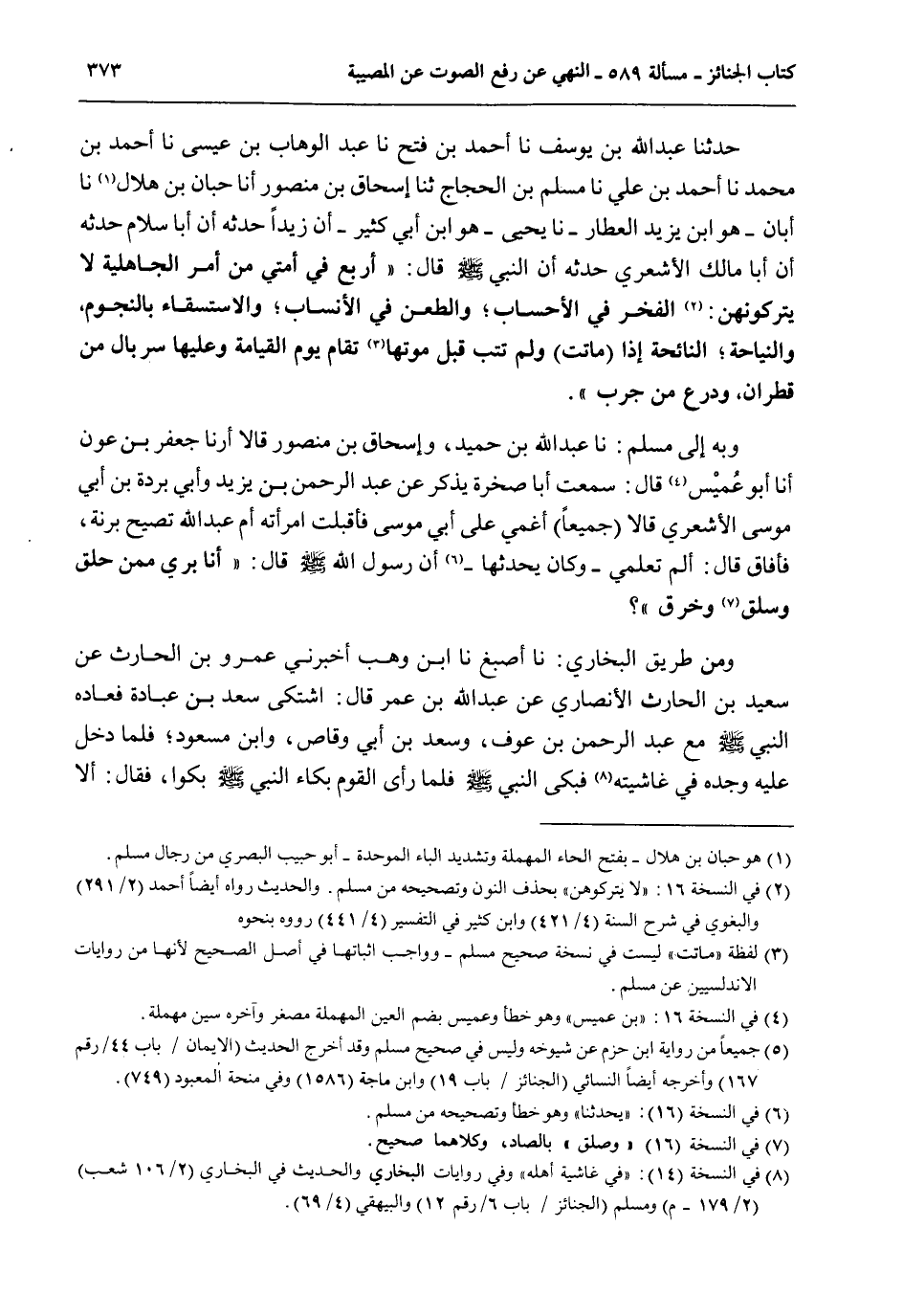 حَدَّثَنَا عَبْدُ اللَّهِ بْنُ يُوسُفَ نا أَحْمَدُ بْنُ فَتْحٍ نا عَبْدُ الْوَهَّابِ بْنُ عِيسَى نا أَحْمَدُ بْنُ مُحَمَّدٍ نا أَحْمَدُ بْنُ عَلِيٍّ نا مُسْلِمُ بْنُ الْحَجَّاجِ ثنا إِسْحَاقُ بْنُ مَنْصُورٍ أَنَا حِبَّانُ بْنُ هِلَالٍ نا أَبَانُ هُوَ ابْنُ يَزِيدَ الْعَطَّارُ - نا يَحْيَى هُوَ ابْنُ أَبِي كَثِيرٍ - أَنَّ زَيْدًا حَدَّثَهُ أَنَّ أَبَا سَلَامٍ حَدَّثَهُ أَنَّ أَبَا مَالِكٍ الْأَشْعَرِيَّ حَدَّثَهُ أَنَّ النَّبِيَّ - صَلَّى اللَّهُ عَلَيْهِ وَسَلَّمَ - قَالَ: «أَرْبَعٌ فِي أُمَّتِي مِنْ أَمْرِ الْجَاهِلِيَّةِ لَا يَتْرُكُونَهُنَّ: الْفَخْرُ فِي الْأَحْسَابِ، وَالطَّعْنُ فِي الْأَنْسَابِ، وَالِاسْتِسْقَاءُ بِالنُّجُومِ، وَالنِّيَاحَةُ، النَّائِحَةُ إذَا مَاتَتْ وَلَمْ تَتُبْ قَبْلَ مَوْتِهَا تُقَامُ يَوْمَ الْقِيَامَةِ وَعَلَيْهَا سِرْبَالٌ مِنْ قَطِرَانٍ، وَدِرْعٌ مِنْ جَرَبٍ» .