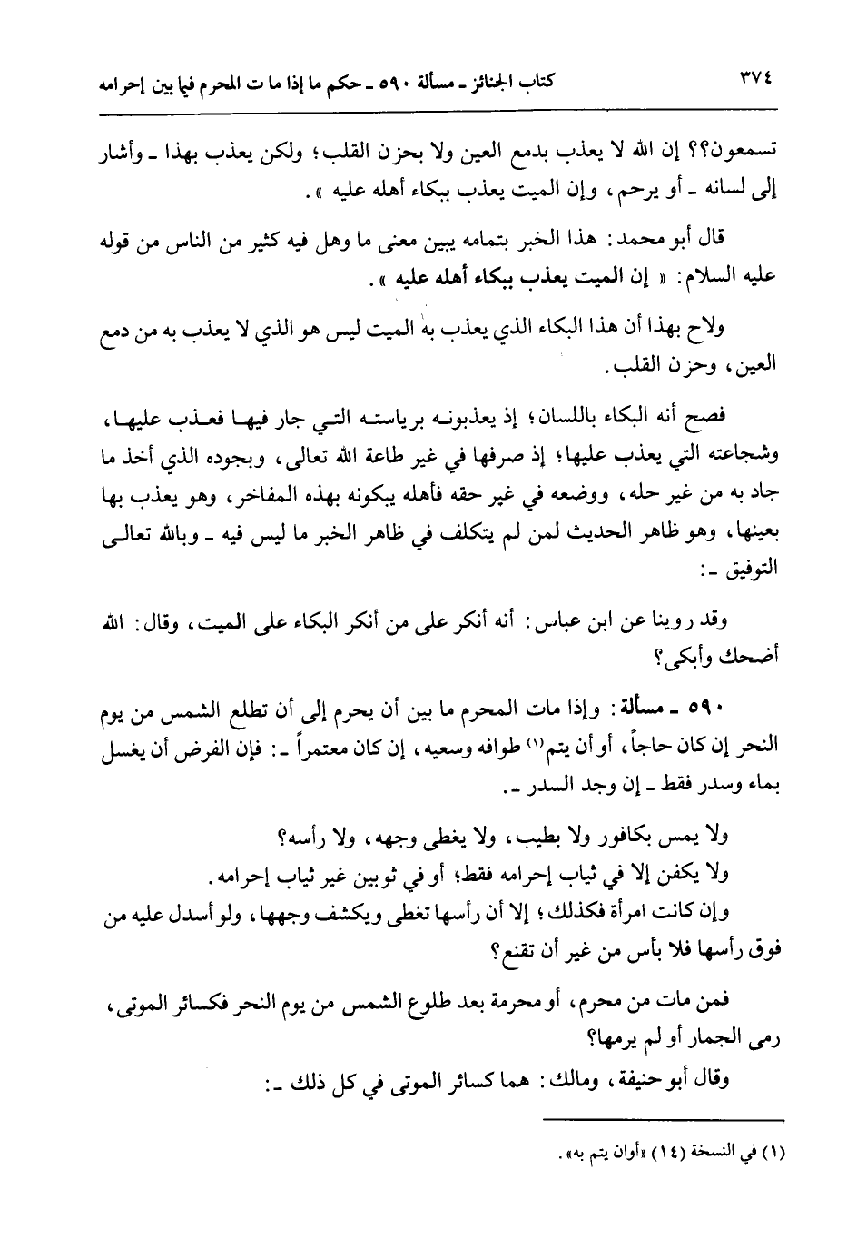 590 - مَسْأَلَةٌ: وَإِذَا مَاتَ الْمُحْرِمُ مَا بَيْنَ أَنْ يُحْرِمَ إلَى أَنْ تَطْلُعَ الشَّمْسُ مِنْ يَوْمِ النَّحْرِ إنْ كَانَ حَاجًّا، أَوْ أَنْ يُتِمَّ طَوَافَهُ وَسَعْيَهُ، إنْ كَانَ مُعْتَمِرًا -: فَإِنَّ الْفَرْضَ أَنْ يُغَسَّلَ بِمَاءٍ وَسِدْرٍ فَقَطْ - إنْ وُجِدَ السِّدْرُ -.