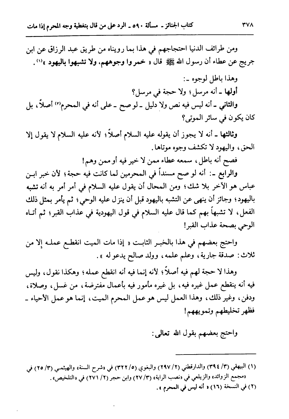 وَهَذَا بَاطِلٌ لِوُجُوهٍ -: أَوَّلُهَا - أَنَّهُ مُرْسَلٌ، وَلَا حُجَّةَ فِي مُرْسَلٍ؟ وَالثَّانِي - أَنَّهُ لَيْسَ فِيهِ نَصٌّ وَلَا دَلِيلٌ - لَوْ صَحَّ - عَلَى أَنَّهُ فِي الْمُحْرِمِ أَصْلًا، بَلْ كَانَ يَكُونُ فِي سَائِرِ الْمَوْتَى؟ وَثَالِثُهَا - أَنَّهُ لَا يَجُوزُ أَنْ يَقُولَهُ - عَلَيْهِ السَّلَامُ - أَصْلًا؛ لِأَنَّهُ - عَلَيْهِ السَّلَامُ - لَا يَقُولُ إلَّا الْحَقَّ، وَالْيَهُودُ لَا تَكْشِفُ وُجُوهَ مَوْتَاهَا.