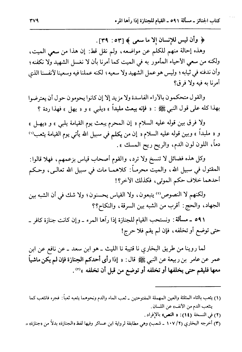 وَهَذِهِ إحَالَةٌ مِنْهُمْ لِلْكَلِمِ عَنْ مَوَاضِعِهِ، وَلَمْ نَقُلْ قَطُّ: إنَّ هَذَا مِنْ سَعْيِ الْمَيِّتِ، وَلَكِنَّهُ مِنْ سَعْيِ الْأَحْيَاءِ الْمَأْمُورِ بِهِ فِي الْمَيِّتِ كَمَا أُمِرْنَا بِأَنْ لَا نُغَسِّلَ الشَّهِيدَ وَلَا نُكَفِّنَهُ، وَأَنْ نَدْفِنَهُ فِي ثِيَابِهِ، وَلَيْسَ هُوَ عَمَلُ الشَّهِيدِ وَلَا سَعْيُهُ، لَكِنَّهُ عَمَلُنَا فِيهِ وَسَعْيُنَا لِأَنْفُسِنَا الَّذِي أُمِرْنَا بِهِ فِيهِ وَلَا فَرْقَ؟