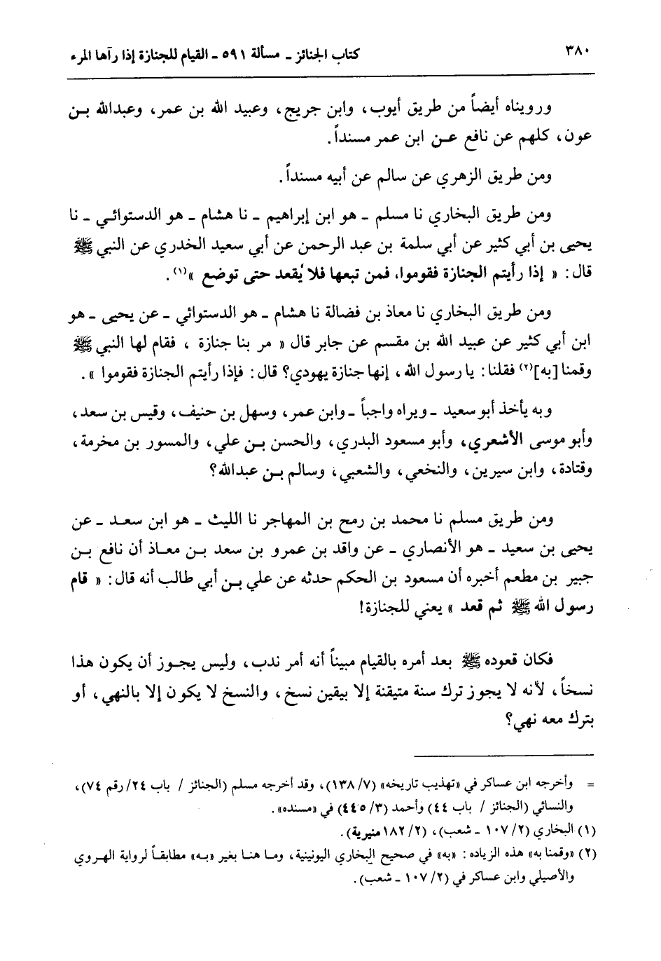 وَمِنْ طَرِيقِ مُسْلِمٍ نا مُحَمَّدُ بْنُ رُمْحِ بْنِ الْمُهَاجِرِ نا اللَّيْثُ هُوَ ابْنُ سَعْدٍ - عَنْ يَحْيَى بْنِ سَعِيدٍ هُوَ الْأَنْصَارِيُّ - عَنْ وَاقِدِ بْنِ عَمْرِو بْنِ سَعْدِ بْنِ مُعَاذٍ أَنَّ نَافِعَ بْنَ جُبَيْرِ بْنِ مُطْعِمٍ أَخْبَرَهُ أَنَّ مَسْعُودَ بْنَ الْحَكَمِ حَدَّثَهُ عَنْ عَلِيِّ بْنِ أَبِي طَالِبٍ أَنَّهُ قَالَ: «قَامَ رَسُولُ اللَّهِ - صَلَّى اللَّهُ عَلَيْهِ وَسَلَّمَ - ثُمَّ قَعَدَ يَعْنِي لِلْجِنَازَةِ» فَكَانَ قُعُودُهُ - صَلَّى اللَّهُ عَلَيْهِ وَسَلَّمَ - بَعْدَ أَمْرِهِ بِالْقِيَامِ مُبَيِّنًا أَنَّهُ أَمْرُ نَدْبٍ، وَلَيْسَ يَجُوزُ أَنْ يَكُونَ هَذَا نَسْخًا؛ لِأَنَّهُ لَا يَجُوزُ تَرْكُ سُنَّةٍ مُتَيَقَّنَةٍ إلَّا بِيَقِينِ نَسْخٍ، وَالنَّسْخُ لَا يَكُونُ إلَّا بِالنَّهْيِ، أَوْ بِتَرْكٍ مَعَهُ نَهْيٌ؟