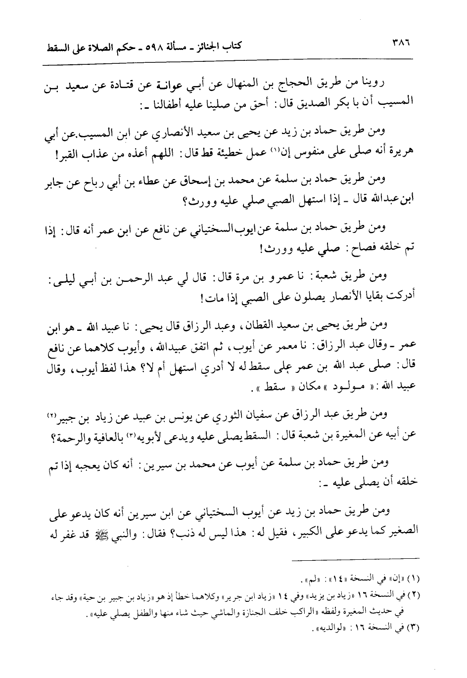 وَمِنْ طَرِيقِ حَمَّادِ بْنِ سَلَمَةَ عَنْ أَيُّوبَ عَنْ مُحَمَّدِ بْنِ سِيرِينَ: أَنَّهُ كَانَ يُعْجِبُهُ إذَا تَمَّ خَلْقُهُ أَنْ يُصَلَّى عَلَيْهِ -: وَمِنْ طَرِيقِ حَمَّادِ بْنِ زَيْدٍ عَنْ أَيُّوبَ السِّخْتِيَانِيِّ «عَنْ ابْنِ سِيرِينَ أَنَّهُ كَانَ يَدْعُو عَلَى الصَّغِيرِ كَمَا يَدْعُو عَلَى الْكَبِيرِ، فَقِيلَ لَهُ: هَذَا لَيْسَ لَهُ ذَنْبٌ؟ فَقَالَ: وَالنَّبِيُّ - صَلَّى اللَّهُ عَلَيْهِ وَسَلَّمَ - قَدْ غُفِرَ لَهُ