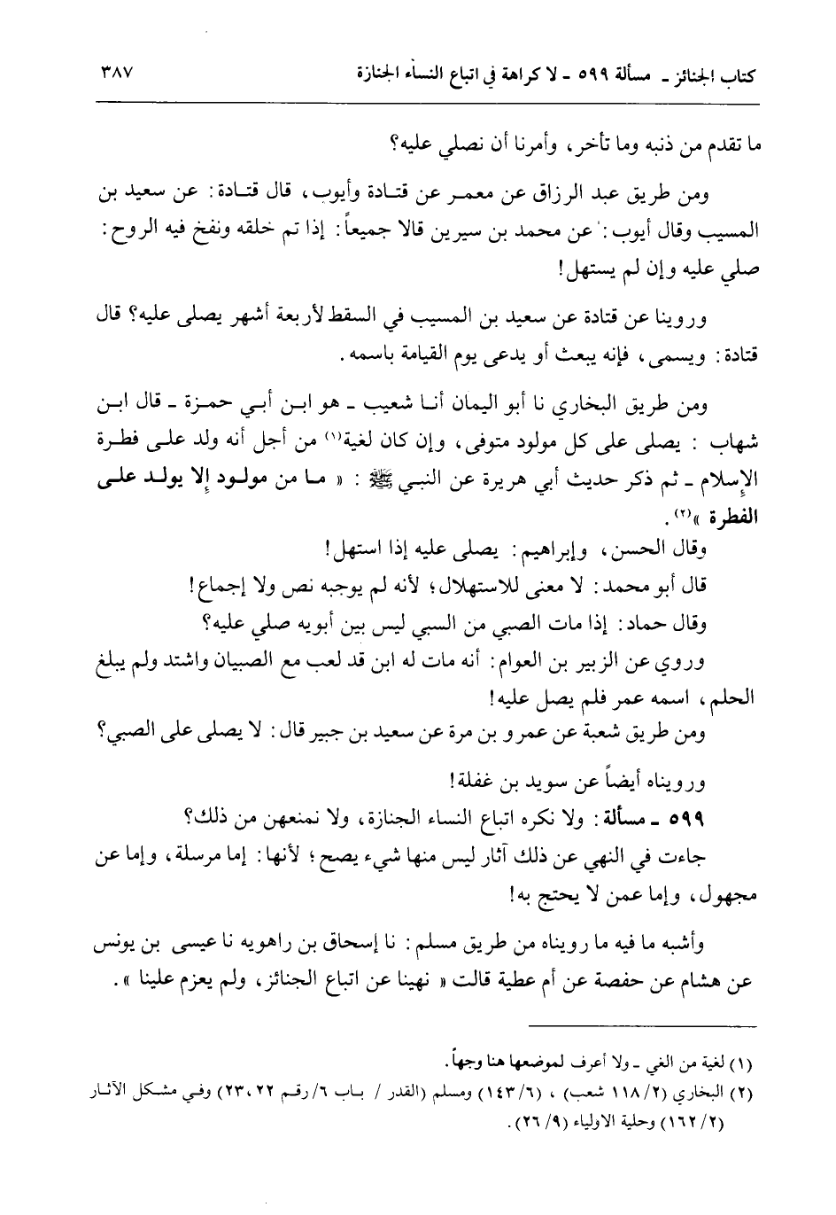 وَمِنْ طَرِيقِ عَبْدِ الرَّزَّاقِ عَنْ مَعْمَرٍ عَنْ قَتَادَةَ وَأَيُّوبَ، قَالَ قَتَادَةُ: عَنْ سَعِيدِ بْنِ الْمُسَيِّبِ وَقَالَ أَيُّوبُ: عَنْ مُحَمَّدِ بْنِ سِيرِينَ قَالَا جَمِيعًا: إذَا تَمَّ خَلْقُهُ وَنُفِخَ فِيهِ الرُّوحُ: صُلِّيَ عَلَيْهِ وَإِنْ لَمْ يَسْتَهِلَّ وَرُوِّينَا عَنْ قَتَادَةَ عَنْ سَعِيدِ بْنِ الْمُسَيِّبِ فِي السِّقْطِ لِأَرْبَعَةِ أَشْهُرٍ يُصَلَّى عَلَيْهِ؟ قَالَ قَتَادَةُ: وَيُسَمَّى، فَإِنَّهُ يُبْعَثُ أَوْ يُدْعَى يَوْمَ الْقِيَامَةِ بِاسْمِهِ. وَمِنْ طَرِيقِ الْبُخَارِيِّ نا أَبُو الْيَمَانِ أَنَا شُعَيْبٌ هُوَ ابْنُ أَبِي حَمْزَةَ - قَالَ ابْنُ شِهَابٍ: يُصَلَّى عَلَى كُلِّ مَوْلُودٍ مُتَوَفًّى، وَإِنْ كَانَ لِغَيَّةٍ مِنْ أَجْلِ أَنَّهُ وُلِدَ عَلَى فِطْرَةِ الْإِسْلَامِ - ثُمَّ ذَكَرَ حَدِيثَ أَبِي هُرَيْرَةَ عَنْ النَّبِيِّ - صَلَّى اللَّهُ عَلَيْهِ وَسَلَّمَ -: «مَا مِنْ مَوْلُودٍ إلَّا يُولَدُ عَلَى الْفِطْرَةِ» .