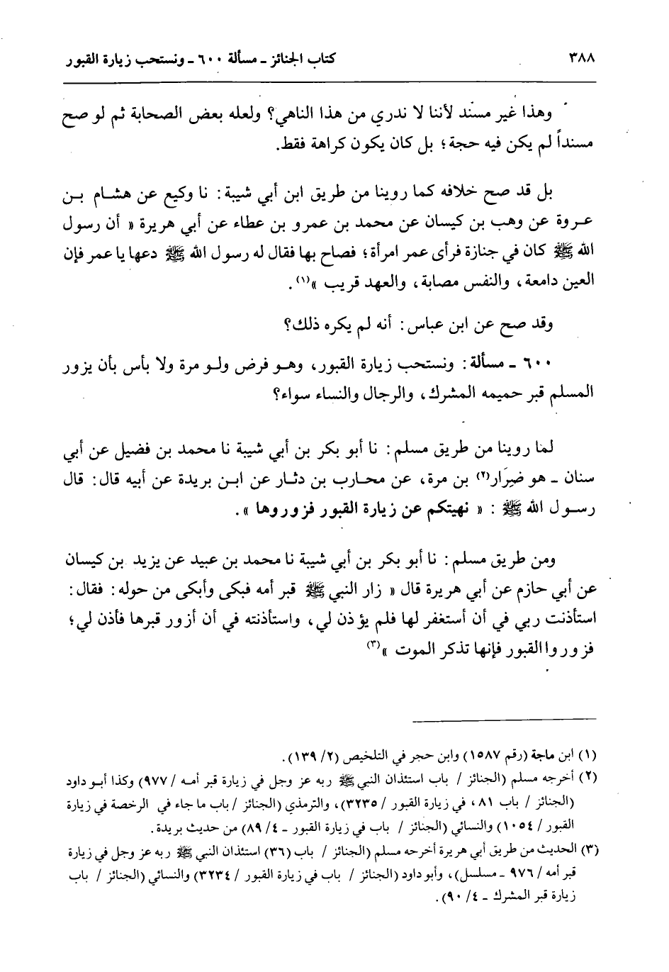 600 - مَسْأَلَةٌ وَنَسْتَحِبُّ زِيَارَةَ الْقُبُورِ، وَهُوَ فَرْضٌ وَلَوْ مَرَّةً وَلَا بَأْسَ بِأَنْ يَزُورَ الْمُسْلِمُ قَبْرَ حَمِيمِهِ الْمُشْرِكِ، وَالرِّجَالُ وَالنِّسَاءُ سَوَاءٌ؟ لِمَا رُوِّينَا مِنْ طَرِيقِ مُسْلِمٍ: نا أَبُو بَكْرِ بْنُ أَبِي شَيْبَةَ نا مُحَمَّدُ بْنُ فُضَيْلٍ عَنْ أَبِي سِنَانٍ هُوَ ضِرَارُ بْنُ مُرَّةَ، عَنْ مُحَارِبِ بْنِ دِثَارٍ عَنْ ابْنِ بُرَيْدَةَ عَنْ أَبِيهِ قَالَ: قَالَ رَسُولُ اللَّهِ - صَلَّى اللَّهُ عَلَيْهِ وَسَلَّمَ -: «نَهَيْتُكُمْ عَنْ زِيَارَةِ الْقُبُورِ فَزُورُوهَا» .