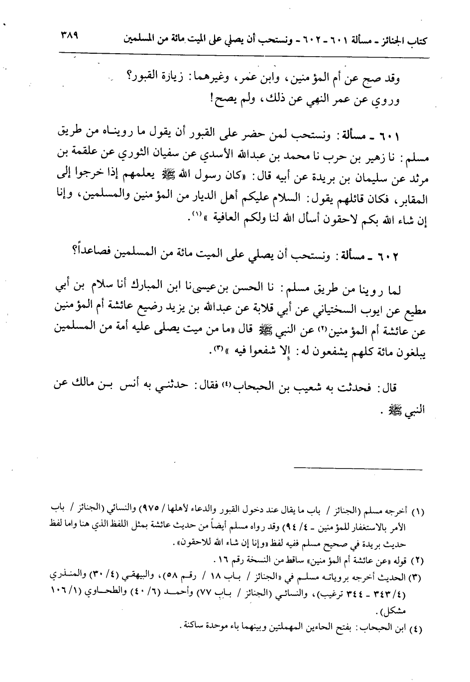 602 - مَسْأَلَةٌ وَنَسْتَحِبُّ أَنْ يُصَلِّيَ عَلَى الْمَيِّتِ مِائَةٌ مِنْ الْمُسْلِمِينَ فَصَاعِدًا؟ لِمَا رُوِّينَا مِنْ طَرِيقِ مُسْلِمٍ: نا الْحَسَنُ بْنُ عِيسَى نا ابْنُ الْمُبَارَكِ أَنَا سَلَّامُ بْنُ أَبِي مُطِيعٍ عَنْ أَيُّوبَ السِّخْتِيَانِيِّ عَنْ أَبِي قِلَابَةَ عَنْ عَبْدِ اللَّهِ بْنِ يَزِيدَ رَضِيعِ عَائِشَةَ أُمِّ الْمُؤْمِنِينَ عَنْ عَائِشَةَ أُمِّ الْمُؤْمِنِينَ عَنْ النَّبِيِّ - صَلَّى اللَّهُ عَلَيْهِ وَسَلَّمَ - قَالَ «مَا مِنْ مَيِّتٍ يُصَلِّي عَلَيْهِ أُمَّةٌ مِنْ الْمُسْلِمِينَ يَبْلُغُونَ مِائَةً كُلُّهُمْ يَشْفَعُونَ لَهُ: إلَّا شُفِّعُوا فِيهِ» .