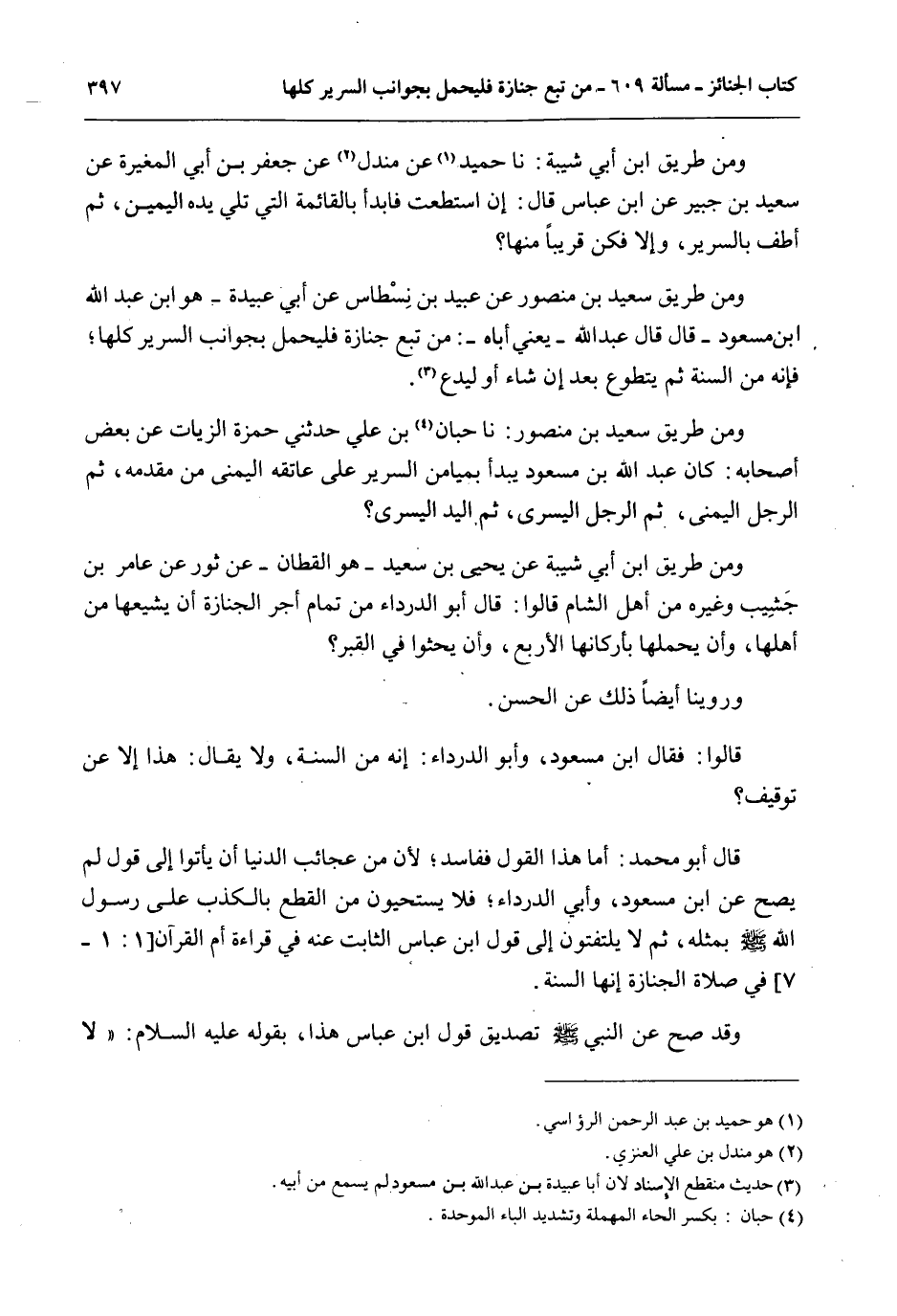وَمِنْ طَرِيقِ سَعِيدِ بْنِ مَنْصُورٍ: نا حِبَّانُ بْنُ عَلِيٍّ حَدَّثَنِي حَمْزَةُ الزَّيَّاتُ عَنْ بَعْضِ أَصْحَابِهِ: كَانَ عَبْدُ اللَّهِ بْنُ مَسْعُودٍ يَبْدَأُ بِمَيَامِنِ السَّرِيرِ عَلَى عَاتِقِهِ الْيُمْنَى مِنْ مُقَدَّمِهِ، ثُمَّ الرِّجْلِ الْيُمْنَى، ثُمَّ الرَّجُلِ الْيُسْرَى، ثُمَّ الْيَدِ الْيُسْرَى؟