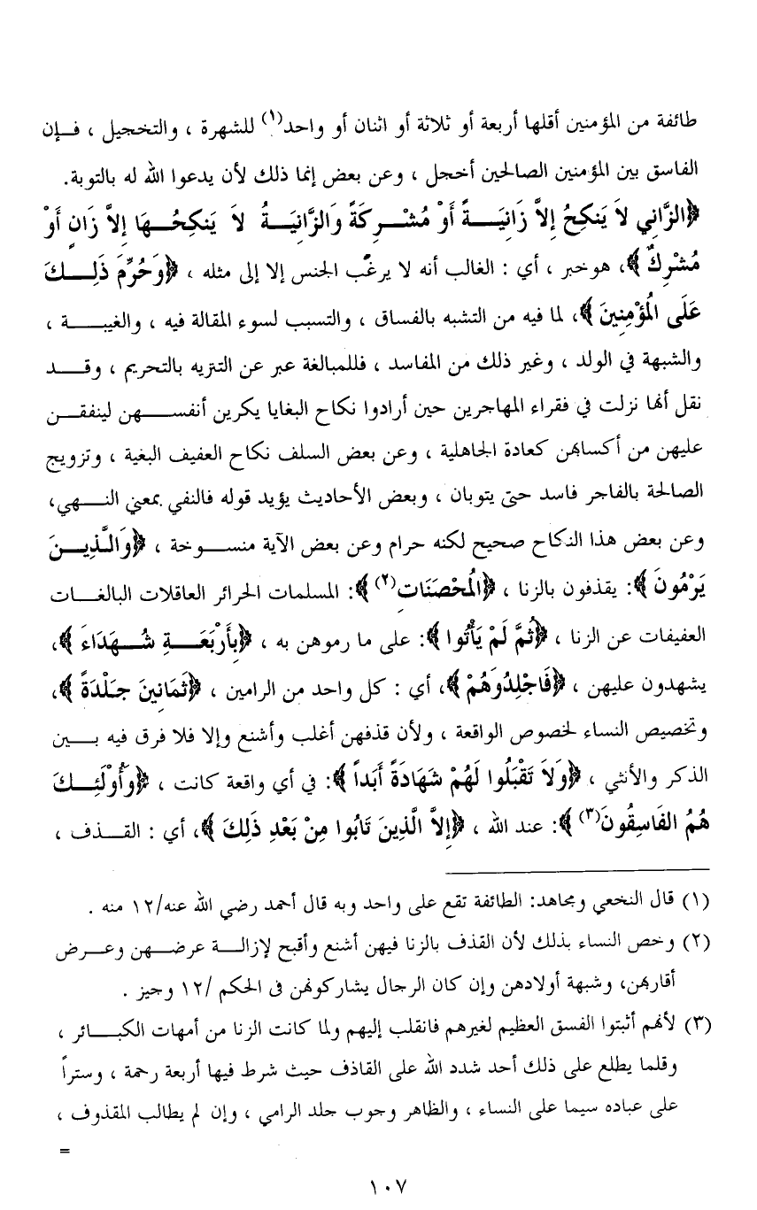 طائفة من المؤمنين أقلها أربعة أو ثلاثة أو اثنان أو واحد للشهرة، والتخجيل، فإن الفاسق يبن المؤمنين الصالحين أخجل، وعن بعض إنما ذلك لأن يدعوا الله له بالتوبة. (الزَّانِي لَا يَنْكِحُ إِلَّا زَانِيَةً أَوْ مُشْرِكَةً وَالزَّانِيَةُ لَا يَنْكِحُهَا إِلَّا زَانٍ أَوْ مُشْرِكٌ)، هو خبر، أي: الغالب أنه لا يرغب الجنس إلا إلى مثله، (وَحُرِّمَ ذَلِكَ عَلَى الْمُؤْمِنِينَ)، لما فيه من التشبه بالفساق، والتسبب لسوء المقالة فيه، والغيبة، والشبهة في الولد، وغير ذلك من المفاسد، فللمبالغة عبر عن التنزيه بالتحريم، وقد نقل أنها نزلت في فقراء المهاجرين حين أرادوا نكاح البغايا يكرين أنفسهن لينفقن عليهن من أكسابهن كعادة الجاهلية، وعن بعض السلف نكاح العفيف البغية، وتزويج الصالحة بالفاجر فاسد حتى يتوبان، وبعض الأحاديث يؤيد قوله فالنفي بمعنى النهي، وعن بعض هذا النكاح صحيح لكنه حرام وعن بعض الآية منسوخة، (وَالَّذِينَ يرْمُون): يقذفون بالزنا، (الْمُحْصَنَاتِ): المسلمات الحرائر العاقلات البالغات العفيفات عن الزنا، (ثمَّ لَم يَأتوا): على ما رموهن به، (بِأَرْبَعَةِ شُهَدَاءَ)، يشهدون عليهن، (فَاجْلِدُوهُمْ)، أي: كل واحد من الرامين، (ثَمَانِينَ جَلْدَةً)، وتخصيص النساء لخصوص الواقعة، ولأن قذفهن أغلب وأشنع وإلا فلا فرق فيه بين الذكر والأنثى، (وَلاَ تَقْبَلُوا لَهُمْ شَهَادَةً أَبَدًا): في أي واقعة كانت، (وأُوْلَئِكَ هُمُ الْفَاسِقُونَ): عند الله، (إِلا الذِينَ تَابُوا مِنْ بَعْدِ ذَلِكَ)، أي: القذف،