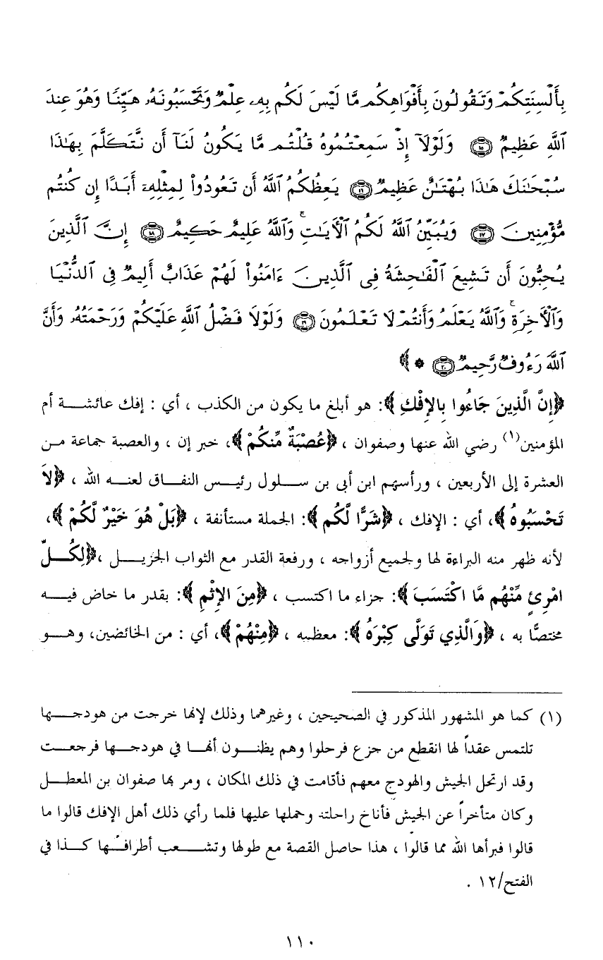 بِأَلْسِنَتِكُمْ وَتَقُولُونَ بِأَفْوَاهِكُمْ مَا لَيْسَ لَكُمْ بِهِ عِلْمٌ وَتَحْسَبُونَهُ هَيِّنًا وَهُوَ عِنْدَ اللهِ عَظِيمٌ (15) وَلَوْلَا إِذْ سَمِعْتُمُوهُ قُلْتُمْ مَا يَكُونُ لَنَا أَنْ نَتَكَلَّمَ بِهَذَا سُبْحَانَكَ هَذَا بُهْتَانٌ عَظِيمٌ (16) يَعِظُكُمُ اللهُ أَنْ تَعُودُوا لِمِثْلِهِ أَبَدًا إِنْ كُنْتُمْ مُؤْمِنِينَ (17) وَيُبَيِّنُ اللهُ لَكُمُ الْآيَاتِ وَاللهُ عَلِيمٌ حَكِيمٌ (18) إِنَّ الَّذِينَ يُحِبُّونَ أَنْ تَشِيعَ الْفَاحِشَةُ فِي الَّذِينَ آمَنُوا لَهُمْ عَذَابٌ أَلِيمٌ فِي الدُّنْيَا وَالْآخِرَةِ وَاللهُ يَعْلَمُ وَأَنْتُمْ لَا تَعْلَمُونَ (19) وَلَوْلَا فَضْلُ اللهِ عَلَيْكُمْ وَرَحْمَتُهُ وَأَنَّ اللهَ رَءُوفٌ رَحِيمٌ (20)