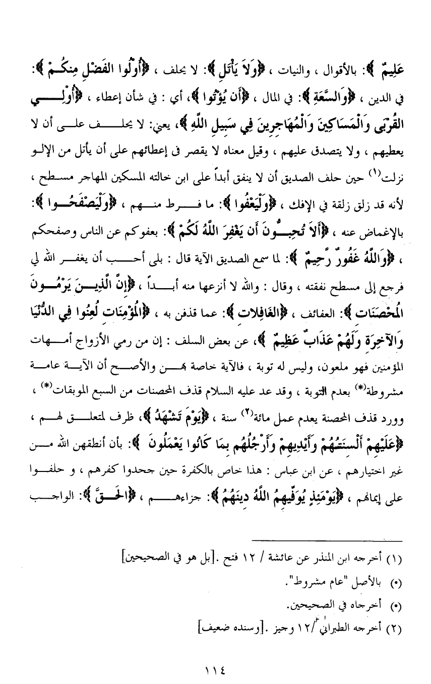 عَلِيمٌ): بالأقوال، والنيات، (وَلَا يَأْتَلِ): لا يحلف، (أُولُو الْفَضْلِ مِنْكُمْ): في الدين، (وَالسَّعَةِ): في المال، (أَنْ يُؤْتُوا)، أي: في شأن إعطاء، (أُولِي الْقُرْبَى وَالْمَسَاكِينَ وَالْمُهَاجِرِينَ فِي سَبِيلِ اللهِ)، يعني: لا يحلف على أن لا يعطيهم، ولا يتصدق عليهم، وقيل معناه لا يقصر في إعطائهم على أن يَأْتَلِ من الإلو نزلت حين حلف الصديق أن لا ينفق أبدًا على ابن خالته المسكين المهاجر مسطح، لأنه قد زلق زلقة في الافك، (وَلْيَعْفُوا): ما فرط منهم، (وَلْيَصْفَحُوا): بالإغماض عنه، (أَلَا تُحِبُّونَ أَنْ يَغْفِرَ اللهُ لَكُمْ): بعفوكم عن الناس وصفحكم، (وَاللهُ غَفُورٌ رَحِيمٌ): لما سمع الصديق الآية قال: بلى أحب أن يغفر الله لي فرجع إلى مسطح نفقته، وقال: والله لا أنزعها منه أبدًا، (إِنَّ الَّذِينَ يَرْمُونَ الْمُحْصَنَاتِ): العفائف، (الْغَافِلَاتِ): عما قذفن به، (الُمؤْمِنَاتِ لُعِنوا فِي الدُّنْيَا وَالْآخِرَةِ وَلَهُمْ عَذَابٌ عَظِيمٌ)، عن بعض السلف: إن من رمى الأزواج أمهات المؤمنين، فهو ملعون، وليس له توبة، فالآية خاصة بهن والأصح أن الآية عامة مشروطة بعدم التوبة، وقد عدَّ عليه السلام قذف المحصنات من السبع الموبقات، وورد قَذْفَ الْمُحْصَنَةِ [يَهْدِمُ] عَمَلَ مِائَةِ سَنَةٍ، (يَوْمَ تَشْهَدُ)، ظرف لمتعلق لهم، (عَلَيْهِمْ أَلْسِنَتُهُمْ وَأَيْدِيهِمْ وَأَرْجُلُهُمْ بِمَا كَانُوا يَعْمَلُونَ): بأن أنطقهن الله من غير اختيارهم، عن ابن عباس: هذا خاص بالكفرة حين جحدوا كفرهم، وحلفوا على إيمانهم، (يَوْمَئِذٍ يُوَفِّيهِمُ اللهُ دِينَهُمُ): جزاءهم، (الْحَقَّ): الواجب