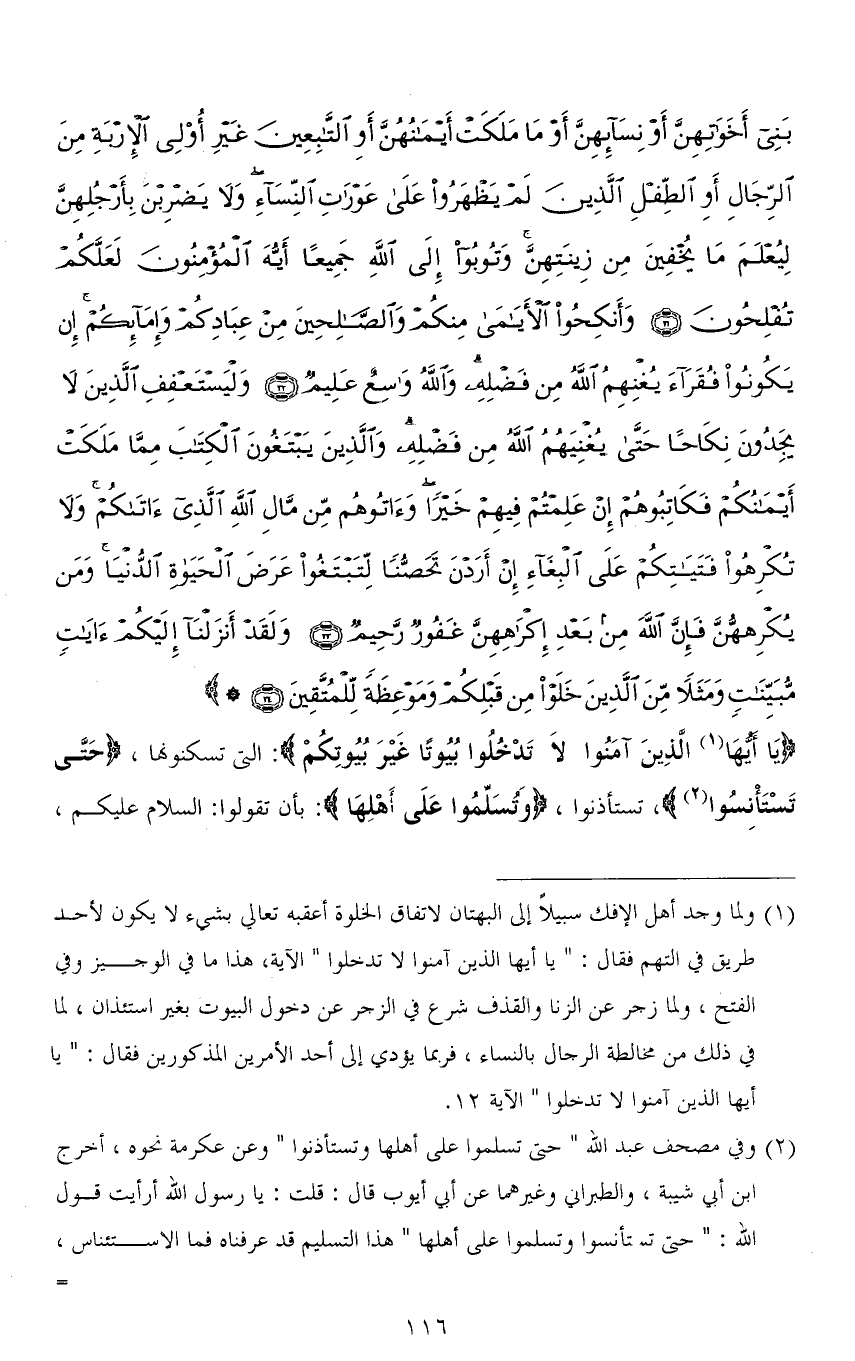 بَنِي أَخَوَاتِهِنَّ أَوْ نِسَائِهِنَّ أَوْ مَا مَلَكَتْ أَيْمَانُهُنَّ أَوِ التَّابِعِينَ غَيْرِ أُولِي الْإِرْبَةِ مِنَ الرِّجَالِ أَوِ الطِّفْلِ الَّذِينَ لَمْ يَظْهَرُوا عَلَى عَوْرَاتِ النِّسَاءِ وَلَا يَضْرِبْنَ بِأَرْجُلِهِنَّ لِيُعْلَمَ مَا يُخْفِينَ مِنْ زِينَتِهِنَّ وَتُوبُوا إِلَى اللهِ جَمِيعًا أَيُّهَ الْمُؤْمِنُونَ لَعَلَّكُمْ تُفْلِحُونَ (31) وَأَنْكِحُوا الْأَيَامَى مِنْكُمْ وَالصَّالِحِينَ مِنْ عِبَادِكُمْ وَإِمَائِكُمْ إِنْ يَكُونُوا فُقَرَاءَ يُغْنِهِمُ اللهُ مِنْ فَضْلِهِ وَاللهُ وَاسِعٌ عَلِيمٌ (32) وَلْيَسْتَعْفِفِ الَّذِينَ لَا يَجِدُونَ نِكَاحًا حَتَّى يُغْنِيَهُمُ اللهُ مِنْ فَضْلِهِ وَالَّذِينَ يَبْتَغُونَ الْكِتَابَ مِمَّا مَلَكَتْ أَيْمَانُكُمْ فَكَاتِبُوهُمْ إِنْ عَلِمْتُمْ فِيهِمْ خَيْرًا وَآتُوهُمْ مِنْ مَالِ اللهِ الَّذِي آتَاكُمْ وَلَا تُكْرِهُوا فَتَيَاتِكُمْ عَلَى الْبِغَاءِ إِنْ أَرَدْنَ تَحَصُّنًا لِتَبْتَغُوا عَرَضَ الْحَيَاةِ الدُّنْيَا وَمَنْ يُكْرِهْهُنَّ فَإِنَّ اللهَ مِنْ بَعْدِ إِكْرَاهِهِنَّ غَفُورٌ رَحِيمٌ (33) وَلَقَدْ أَنْزَلْنَا إِلَيْكُمْ آيَاتٍ مُبَيِّنَاتٍ وَمَثَلًا مِنَ الَّذِينَ خَلَوْا مِنْ قَبْلِكُمْ وَمَوْعِظَةً لِلْمُتَّقِينَ (34)