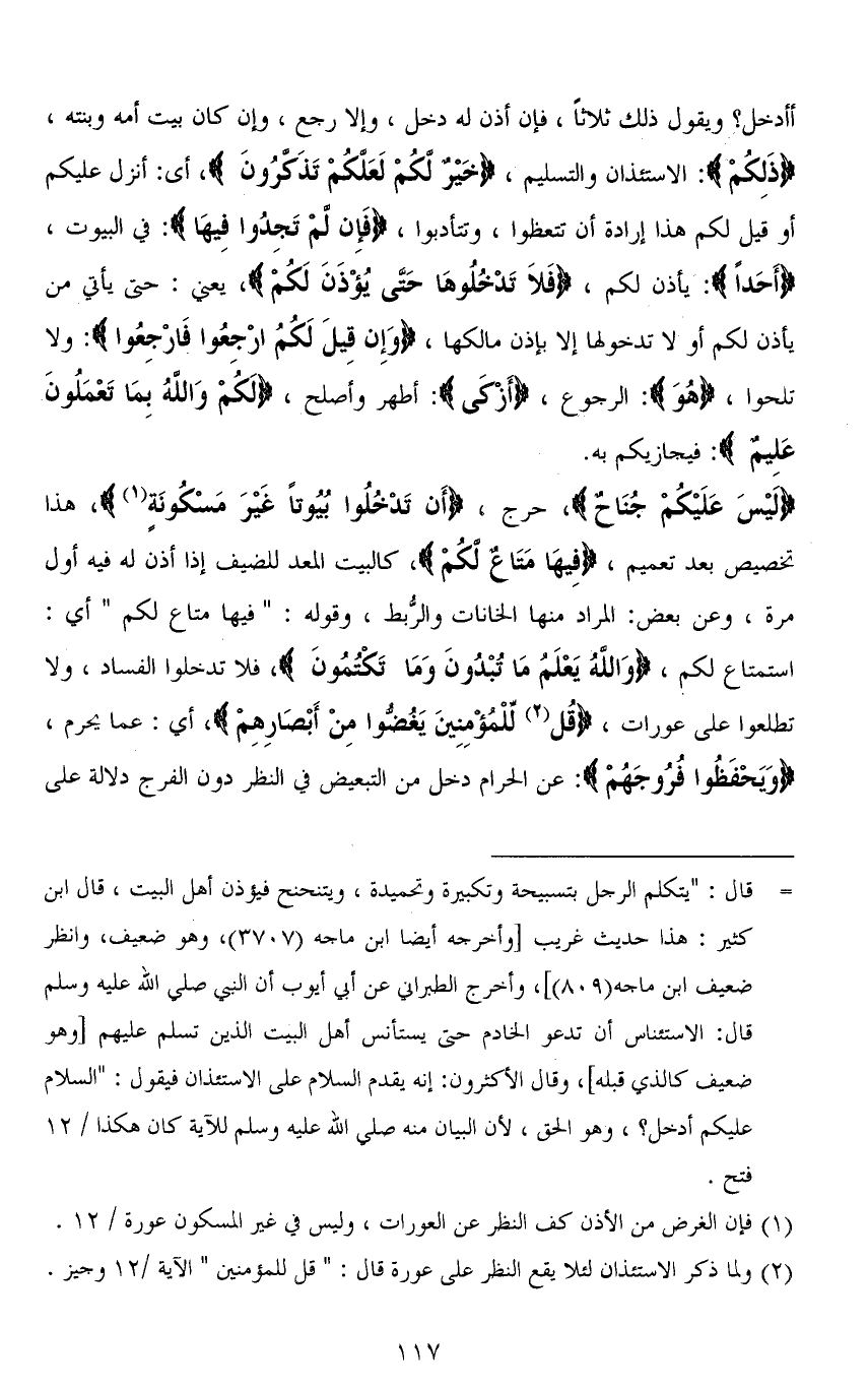أأدخل؟ ويقول ذلك ثلاثًا، فإن أذن له دخل، وإلا رجع، وإن كان بيت أمه وبنته، (ذَلِكُمْ): الاستئذان والتسليم، (خَيْرٌ لَكُمْ لَعَلَّكُمْ تَذَكَّرُونَ)، أي: أنزل عليكم أو قيل لكم هذا إرادة أن تتعظوا، وتتأدبوا، (فَإِنْ لَمْ تَجِدُوا فِيهَا): في البيوت، (أَحَدًا): يأذن لكم، (فَلَا تَدْخُلُوهَا حَتَّى يُؤْذَنَ لَكُمْ)، يعني: حتى يأتي من يأذن لكم أو لا تدخولها إلا بإذن مالكها، (وَإِنْ قِيلَ لَكُمُ ارْجِعُوا فَارْجِعُوا): ولا تلحوا، (هُوَ): الرجوع، (أَزْكَى): أطهر وأصلح، (لَكُمْ وَاللهُ بِمَا تَعْمَلُونَ عَلِيمٌ): فيجازيكم به. (لَيْسَ عَلَيْكُمْ جُنَاحٌ)، حرج، (أَن تَدْخُلُوا بُيُوتاً غيْرَ مَسْكُونَةٍ)، هذا تخصيص بعد تعميم، (فِيهَا مَتَاعٌ لَكُمْ)، كالبيت المعد للضيف إذا أذن له فيه أول مرة، وعن بعض: المراد منها الخانات والرُّبط، وقوله: " فِيهَا مَتَاعٌ لَكُمْ " أي: استمتاع لكم، (وَاللهُ يَعْلَمُ مَا تُبْدُونَ وَمَا تَكتُمُون)، فلا تدخلوا الفساد، ولا تطلعوا على عورات، (قُلْ لِلْمُؤْمِنِينَ يَغُضُّوا مِنْ أَبْصَارِهِمْ)، أي: عما يحرم، (وَيَحْفَظُوا فُرُوجَهُمْ): عن الحرام دخل من التبعيض في النظر دون الفرج دلالة على