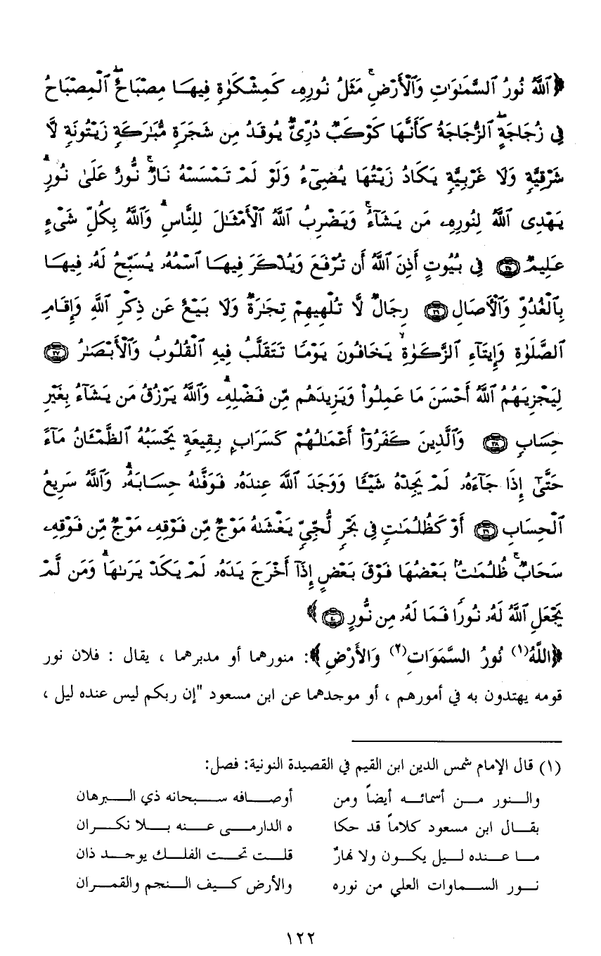 (اللهُ نُورُ السَّمَاوَاتِ وَالْأَرْضِ مَثَلُ نُورِهِ كَمِشْكَاةٍ فِيهَا مِصْبَاحٌ الْمِصْبَاحُ فِي زُجَاجَةٍ الزُّجَاجَةُ كَأَنَّهَا كَوْكَبٌ دُرِّيٌّ يُوقَدُ مِنْ شَجَرَةٍ مُبَارَكَةٍ زَيْتُونَةٍ لَا شَرْقِيَّةٍ وَلَا غَرْبِيَّةٍ يَكَادُ زَيْتُهَا يُضِيءُ وَلَوْ لَمْ تَمْسَسْهُ نَارٌ نُورٌ عَلَى نُورٍ يَهْدِي اللهُ لِنُورِهِ مَنْ يَشَاءُ وَيَضْرِبُ اللهُ الْأَمْثَالَ لِلنَّاسِ وَاللهُ بِكُلِّ شَيْءٍ عَلِيمٌ (35) فِي بُيُوتٍ أَذِنَ اللهُ أَنْ تُرْفَعَ وَيُذْكَرَ فِيهَا اسْمُهُ يُسَبِّحُ لَهُ فِيهَا بِالْغُدُوِّ وَالْآصَالِ (36) رِجَالٌ لَا تُلْهِيهِمْ تِجَارَةٌ وَلَا بَيْعٌ عَنْ ذِكْرِ اللهِ وَإِقَامِ الصَّلَاةِ وَإِيتَاءِ الزَّكَاةِ يَخَافُونَ يَوْمًا تَتَقَلَّبُ فِيهِ الْقُلُوبُ وَالْأَبْصَارُ (37) لِيَجْزِيَهُمُ اللهُ أَحْسَنَ مَا عَمِلُوا وَيَزِيدَهُمْ مِنْ فَضْلِهِ وَاللهُ يَرْزُقُ مَنْ يَشَاءُ بِغَيْرِ حِسَابٍ (38) وَالَّذِينَ كَفَرُوا أَعْمَالُهُمْ كَسَرَابٍ بِقِيعَةٍ يَحْسَبُهُ الظَّمْآنُ مَاءً حَتَّى إِذَا جَاءَهُ لَمْ يَجِدْهُ شَيْئًا وَوَجَدَ اللهَ عِنْدَهُ فَوَفَّاهُ حِسَابَهُ وَاللهُ سَرِيعُ الْحِسَابِ (39) أَوْ كَظُلُمَاتٍ فِي بَحْرٍ لُجِّيٍّ يَغْشَاهُ مَوْجٌ مِنْ فَوْقِهِ مَوْجٌ مِنْ فَوْقِهِ سَحَابٌ ظُلُمَاتٌ بَعْضُهَا فَوْقَ بَعْضٍ إِذَا أَخْرَجَ يَدَهُ لَمْ يَكَدْ يَرَاهَا وَمَنْ لَمْ يَجْعَلِ اللهُ لَهُ نُورًا فَمَا لَهُ مِنْ نُورٍ (40)