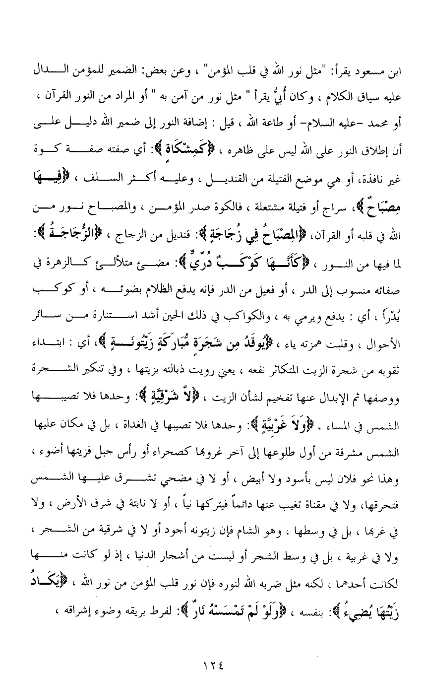 ابن مسعود يقرأ: " مثل نور الله في قلب المؤمن "، وعن بعض: الضمير للمؤمن الدال عليه سياق الكلام، وكان أبيٌّ يقرأ " مثل نور من آمن به " أو المراد من النور القرآن، أو محمد - عليه السلام - أو طاعة الله، قيل: إضافة النور إلى ضمير الله دليل على أن إطلاق النور على الله ليس على ظاهره، (كَمِشْكَاةٍ): أي صفته صفة كوة غير نافذة، أو هي موضع الفتيلة من القنديل، وعليه أكثر السلف، (فِيهَا مِصْبَاحٌ)، سراج أو فتيلة مشتعلة، فالكوة صدر المؤمن، والمصباح نور من الله في قلبه أو القرآن، (الْمِصْبَاحُ فِي زُجَاجَةٍ): قنديل من الزجاج، (الزُّجَاجَةُ): لما فيها من النور، (كَأَنَّهَا كَوْكَبٌ دُرِّيٌّ): مضيء متلألئ كالزهرة في صفائه منسوب إلى الدر، أو فعيل من الدر فإنه يدفع الظلام بضوئه، أو كوكب يُدْرَأ، أي: يدفع ويرمي به، والكواكب في ذلك الحين أشد استنارة من سائر الأحوال، وقلبت همزته ياء، (يُوقَدُ مِنْ شَجَرَةٍ مُبَارَكَةٍ زَيْتُونَةٍ)، أي: ابتداء ثقوبه من شجرة الزيت المتكاثر نفعه، يعني رويت ذبالته بزيتها، وفي تنكير الشجرة ووصفها ثم الإبدال عنها تفخيم لشأن الزيت، (لَا شَرْقِيَّةٍ): وحدها فلا تصيبها الشمس في المساء، (وَلَا غَرْبِيَّةٍ): وحدها فلا تصيبها في الغداة، بل في مكان عليها الشمس مشرقة من أول طلوعها إلى آخر غروبها كصحراء أو رأس جبل فزيتها أضوء، وهذا نحو فلان ليس بأسود ولا أبيض، أو لا في مضحي تشرق عليها الشمس فتحرقها، ولا في مقناة تغيب عنها دائمًا فيتركها نيًا، أو لا نابتة في شرق الأرض، ولا في غربها، بل في وسطها، وهو الشام فإن زيتونه أجود أو لا في شرقية من الشجر، ولا في غربية، بل في وسط الشجر أو ليست من أشجار الدنيا، إذ لو كانت منها لكانت أحدهما، لكنه مثل ضربه الله لنوره فإن نور قلب المؤمن من نور الله، (يَكَادُ زَيْتُهَا يُضِيءُ): بنفسه، (وَلَوْ لَمْ تَمْسَسْهُ نَارٌ): لفرط بريقه وضوء إشراقه،