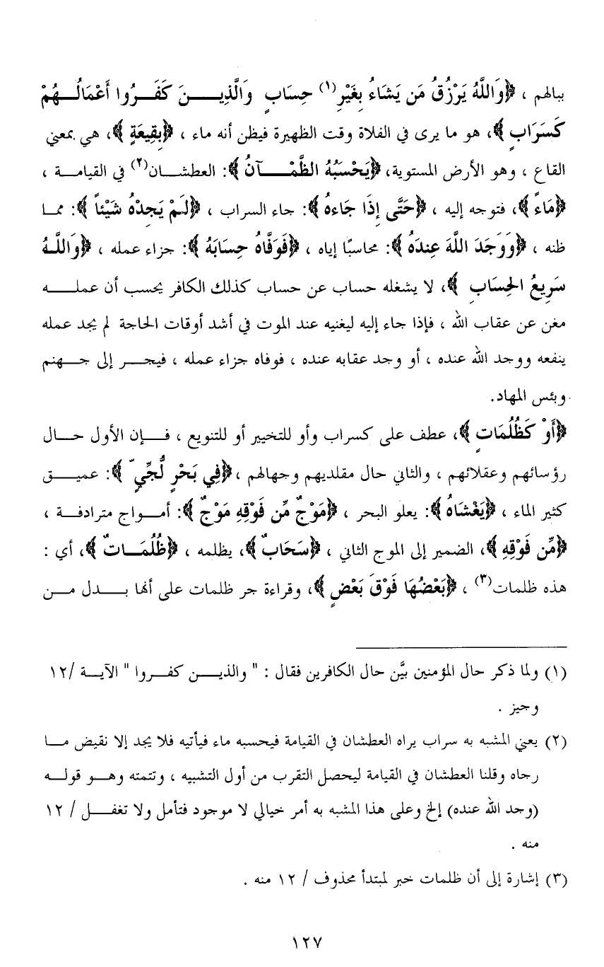 ببالهم، (وَاللهُ يَرْزُقُ مَن يَشَاءُ بِغَيْرِ حِسَابٍ وَالَّذِينَ كفَرُوا أَعْمَالُهُمْ كَسَرَابٍ)، هو ما يرى في الفلاة وقت الظهيرة فيظن أنه ماء، (بِقِيعَةٍ)، هي. بمعنى القاع، وهو الأرض المستوية، (يَحْسَبُهُ الظَّمْآنُ): العطشان في القيامة، (مَاءً)، فتوجه إليه، (حَتَّى إِذَا جَاءهُ): جاء السراب، (لمْ يَجِدْهُ شَيْئًا): مما ظنه، (وَوَجَدَ الله عِندَهُ): محاسبًا إياه، (فَوَفَّاهُ حِسَابَهُ): جزاء عمله، (وَاللهُ سَرِيعُ الْحِسَابِ)، لا يشغله حساب عن حساب كذلك الكافر يحسب أن عمله مغن عن عقاب الله، فإذا جاء إليه ليغنيه عند الموت في أشد أوقات الحاجة لم يجد عمله ينفعه ووجد الله عنده، أو وجد عقابه عنده، فوفاه جزاء عمله، فيجر إلى جهنم وبئس المهاد.