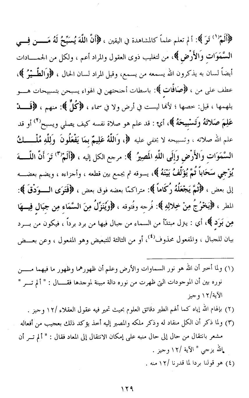 (أَلَمْ تَرَ): ألم تعلم علمًا كالمشاهدة في اليقين، (أَنَّ اللهَ يُسَبِّحُ لَهُ مَن فِي السَّمَاوَاتِ وَالأَرْضِ)، من لتغليب ذوى العقول والمراد أعم، ولكل من الجمادات أيضًا لسان به يذكرون الله يسمعه من يسمع، وقيل المراد لسان الحال، (وَالطيْرُ)، عطف على من، (صَافَّاتٍ): باسطات أجنحتهن في الهواء يسبحن بتسبيحات هو يلهمها، قيل: خصها؛ لأنها ليست في أرض ولا في سماء، (كُلٌّ): منهم، (قَدْ عَلِمَ صَلَاتَهُ وَتَسْبِيحَهُ)، أي: قد علم هو صلاة نفسه كيف يصلي ويسبح أو قد علم الله صلاته، وتسبيحه لا يخفي عليه، (وَاللهُ عَلِيمٌ بِمَا يَفْعَلُونَ وَللهِ مُلْك السَّمَاوَاتِ وَالأَرْضِ وَإِلَى اللهِ المَصيِرُ): مرجع الكل إليه، (أَلَمْ تَرَ أَنَّ اللهَ يُزْجِي سَحَابًا ثُمَّ يُؤَلِّفُ بَيْنَهُ)، يسوقه ثم يجمع بين قطعه، وأجزاءه، ويضم بعضه إلى بعض، (ثُمَّ يَجْعَلُهُ رُكَامً): متراكمًا بعضه فوق بعض، (فتَرَى الوَدْقَ): المطر، (يَخْرُجُ مِنْ خِلالِهِ): فُرجِه وفُتوقه، (وَيُنَزِّلُ مِنَ السَّمَاءِ مِن جِبَالٍ فِيهَا مِن بَرَدٍ)، أي: ينزل مبتدًأ من السماء من جبال فيها من برد بردًا، فيكون من برد بيان للجبال، والمفعول محذوف، أو من الثالثة للتبعيض وهو المفعول، وعن بعض