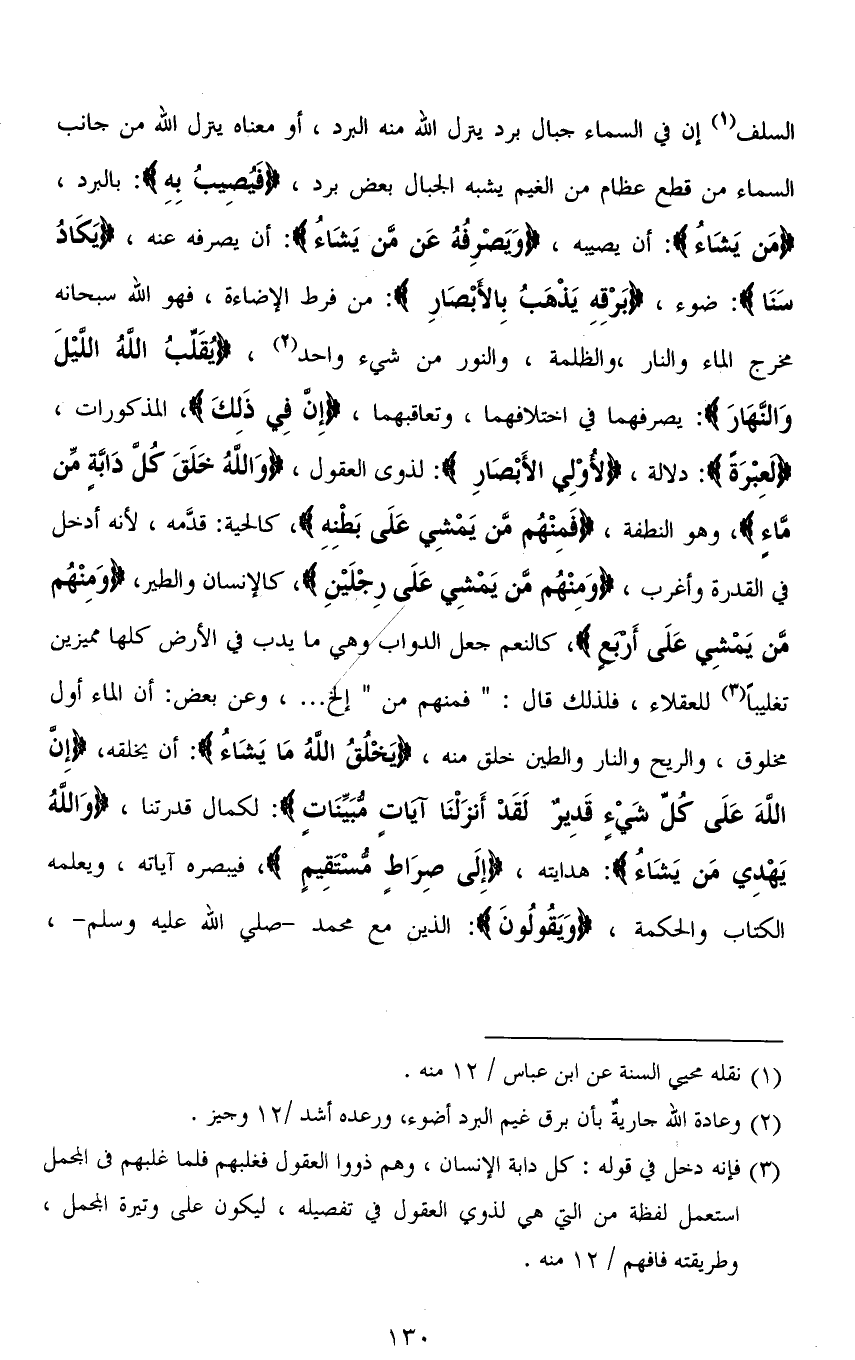 السلف إن في السماء جبال برد ينزل الله منه البرد، أو معناه ينزل الله من جانب السماء من قطع عظام من الغيم يشبه الجبال بعض برد، (فَيُصِيبُ بِهِ): بالبرد، (مَن يَشَاءُ): أن يصيبه، (وَيَصْرِفُهُ عَنْ مَنْ يَشَاءُ): أن يصرفه عنه، (يَكَادُ سَنَا): ضوء، (بَرْقِهِ يَذْهَبُ بِالْأَبْصَارِ): من فرط الإضاءة، فهو الله سبحانه مخرج الماء والنار، والظلمة، والنور من شيء واحد، (يُقَلِّبُ اللهُ اللَّيْلَ وَالنَّهَارَ): يصرفهما في اختلافهما، وتعاقبهما، (إِنَّ فِي ذَلِكَ)، المذكورات، (لَعِبْرَةً): دلالة، (لِأُولِي الْأَبْصَارِ): لذوي العقول، (وَاللهُ خَلَقَ كُلَّ دَابَّةٍ مِنْ مَاءٍ)، وهو النطفة، (فَمِنْهُمْ مَنْ يَمْشِي عَلَى بَطْنِهِ)، كالحية: قدَّمه، لأنه أدخل في القدرة وأغرب، (وَمِنْهُمْ مَنْ يَمْشِي عَلَى رِجْلَيْنِ)، كالإنسان والطير، (وَمِنْهُمْ مَنْ يَمْشِي عَلَى أَرْبَعٍ)، كالنعم جعل الدواب وهي ما يدب في الأرض كلها مميزين تغليبًا للعقلاء، فلذلك قال: (فمنهم من) إلخ ... ، وعن بعض: أن الماء أول مخلوق، والريح والنار والطين خلق منه، (يَخْلُقُ اللهُ مَا يَشَاءُ): أن يخلقه، (إِنَّ اللهَ عَلَى كُلِّ شَيْءٍ قَدِيرٌ لَقَدْ أَنْزَلْنَا آيَاتٍ مُبَيِّنَاتٍ): لكمال قدرتنا، (وَاللهُ يَهْدِي مَن يَشَاءُ). هدايته، (إِلَى صِرَاطٍ مسْتَقِيمٍ)، فيبصره آياته، ويعلمه الكتاب والحكمة، (وَيَقُولوُنَ): الذين مع محمد - صلي الله عليه وسلم -،