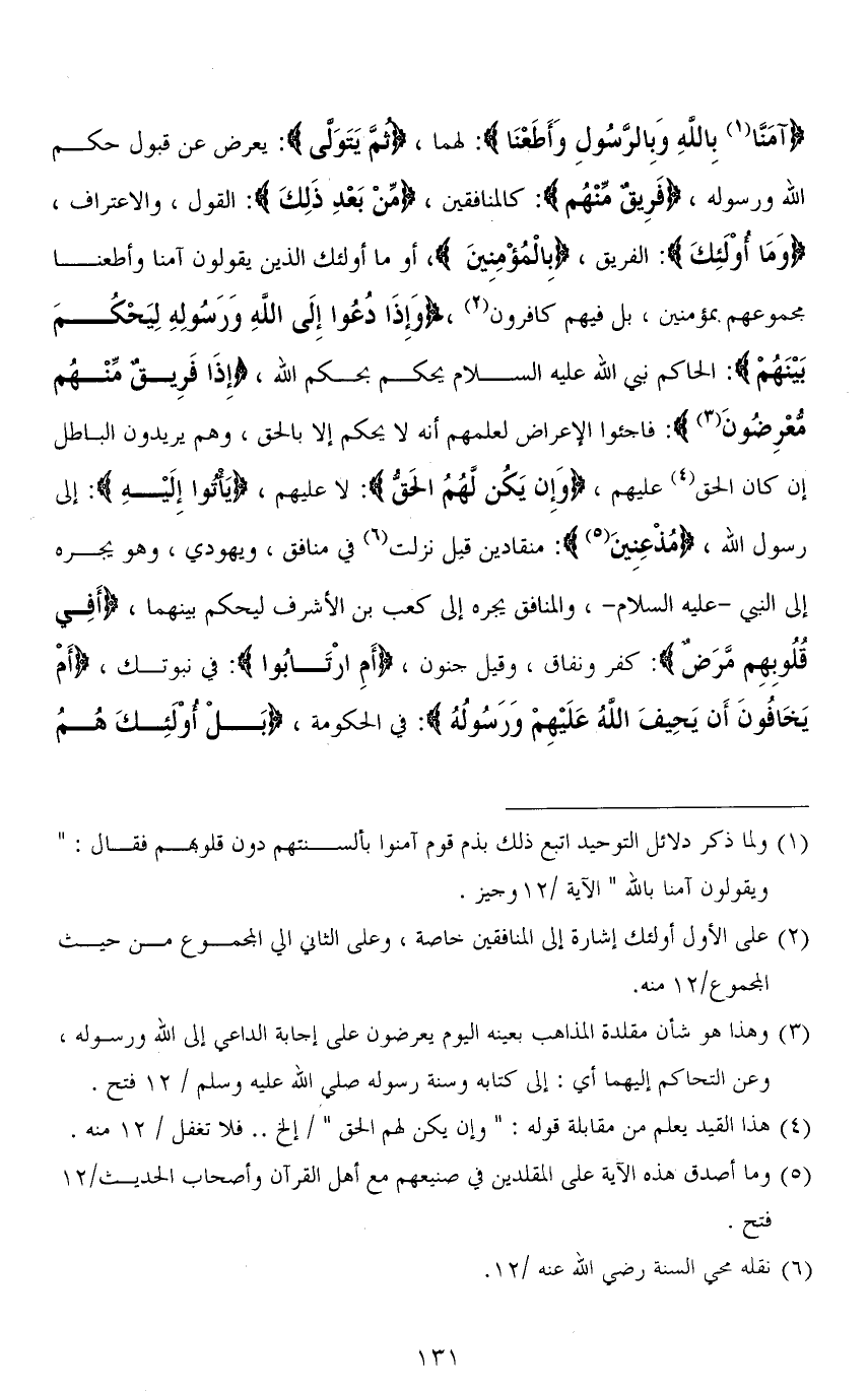 (آمَنَّا بِاللهِ وَبِالرَّسُولِ وَأَطَعْنَا): لهما، (ثُمَّ يَتَوَلَّى): يعرض عن قبول حكم الله ورسوله، (فَرِيقٌ منْهُم): كالمنافقين، (مِّنْ بَعْدِ ذَلِكَ): القول، والاعتراف، (وَمَا أُوْلَئِكَ): الفريق، (بِالْمُؤْمِنِينَ)، أو ما أُوْلَئِكَ الذين يقولون آمنا وأطعنا مجموعهم بمؤمنين، بل فيهم كافرون، (وَإِذَا دُعُوا إِلَى اللهِ وَرَسُولِهِ لِيَحْكُم بَيْنَهُم): الحاكم نبي الله عليه السلام يحكم بحكم الله، (إِذَا فَرِيقٌ منْهُم مُّعْرِضون): فاجئوا الإعراض لعلمهم أنه لا يحكم إلا بالحق، وهم يريدون الباطل إن كان الحق عليهم، (وَإِنْ يَكُنْ لَهُمُ الْحَقُّ): لا عليهم، (يَأْتُوا إِلَيْهِ): إلى رسول الله، (مُذْعِنِينَ): منقادين قيل نزلت في منافق، ويهودي، وهو يجره إلى النبي - عليه السلام -، والمنافق يجره إلى كعب بن الأشرف ليحكم بينهما، (أَفِي قُلُوبِهِمْ مَرَضٌ): كفر ونفاق، وقيل جنون، (أَمِ ارْتَابُوا): في نبوتك، (أَمْ يَخَافُونَ أَن يَحِيفَ اللهُ عَلَيْهِمْ وَرَسولُهُ): في الحكومة، (بَلْ أُوْلَئِكَ هُمُ