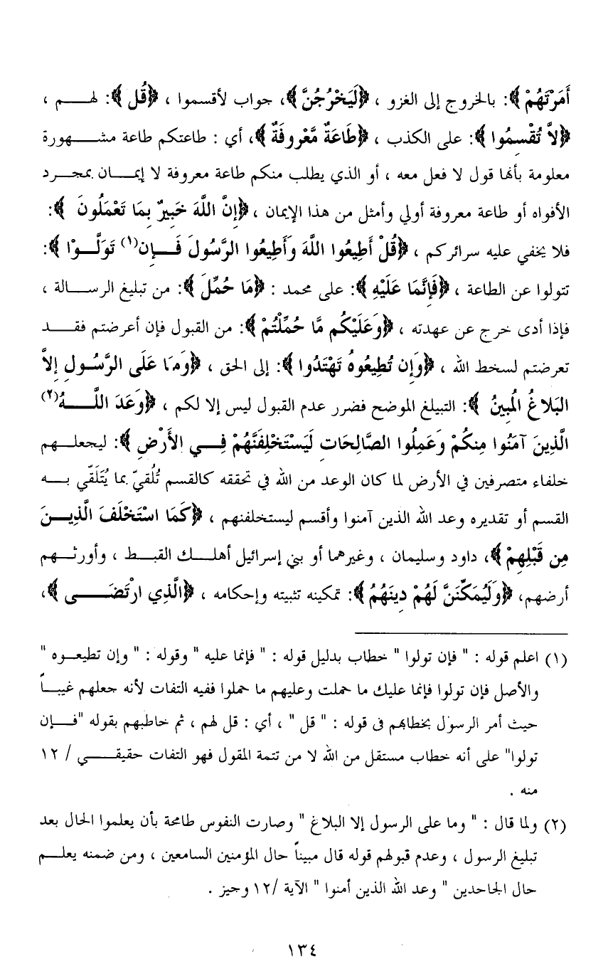 أَمَرْتَهُمْ): بالخروج إلى الغزو، (لَيَخْرُجُنَّ)، جواب لأقسموا، (قُل): لهم، (لا تُقْسِمُوا): على الكذب، (طَاعَةٌ مَعْرُوفَةٌ)، أي: طاعتكم طاعة مشهورة معلومة بأنها قول لا فعل معه، أو الذي يطلب منكم طاعة معروفة لا إيمان بمجرد الأفواه أو طاعة معروفة أولى وأمثل من هذا الإيمان، (إِنَّ اللهَ خَبِيرٌ بِمَا تَعْمَلُون): فلا يخفي عليه سرائركم، (قُلْ أَطِيعُوا اللهَ وَأَطِيعُوا الرَّسُولَ فَإِنْ تَوَلَّوْا): تتولوا عن الطاعة، (فَإِنَّمَا عَلَيْهِ): على محمد: (مَا حُمِّلَ): من تبليغ الرسالة، فإذا أدى خرج عن عهدته، (وَعَلَيْكُمْ مَا حُمِّلْتُمْ): من القبول فإن أعرضتم فقد تعرضتم لسخط الله، (وَإِن تُطِيعُوهُ تَهْتَدُوا): إلى الحق، (وَمَا عَلَى الرَّسُولِ إِلَّا الْبَلَاغُ الْمُبِينُ): التبيلغ الموضح فضرر عدم القبول ليس إلا لكم، (وَعَدَ اللهُ الَّذِينَ آمَنُوا مِنْكُمْ وَعَمِلُوا الصَّالِحَاتِ لَيَسْتَخْلِفَنَّهُمْ فِي الْأَرْضِ): ليجعلهم خلفاء متصرفين في الأرض لما كان الوعد من الله في تحققه كالقسم تُلُقي بما يُتَلَقّى به القسم أو تقديره وعد الله الذين آمنوا وأقسم ليستخلفنهم، (كَمَا اسْتَخْلَفَ الذِينَ مِن قَبْلِهِمْ)، داود وسليمان، وغيرهما أو بني إسرائيل أهلك القبط، وأورثهم أرضهم، (وَلَيُمَكِّنَنَّ لَهُمْ دِينَهُمُ): تمكينه تثبيته وإحكامه، (الَّذِي ارْتَضَى)،