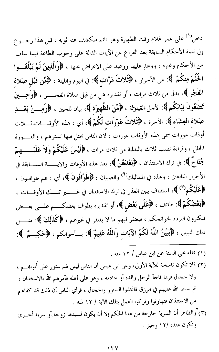 دخل على عمر غلام وقت الظهيرة وهو نائم منكشف عنه ثوبه، قيل هذا رجوع إلى تتمة الأحكام السابقة بعد الفراغ عن الآيات الدالة على وجوب الطاعة فيما سلف من الأحكام وغيره، ووعدٍ عليها ووعيد على الإعراض عنها، (وَالذِينَ لَمْ يَبْلُغُوا الحُلُمَ مِنكُمْ): من الأحرار، (ثَلاثَ مَرَّاتٍ): في اليوم والليلة، (مّن قَبْلِ صَلاةِ الفَجْرِ)، بدل من ثلاث مرات، أو تقديره هي من قبل صلاة الفجر، (وَحِينَ تَضَعُونَ ثِيَابَكُم): لأجل القيلولة، (مِّنَ الظهِيرَة)، بيان للحين، (وَمِنْ بَعْدِ صَلاةِ العِشَاءِ): الآخرة، (ثَلاثُ عَوْرَاتٍ لَكُم)، أي: هذه الأوقات ثلاث أوقات عورات سمى هذه الأوقات عورات، لأن الناس يختل فيها تسترهم، والعورة الخلل، وقراءة نصب ثلاث بالبدلية من ثلاث مرات، (لَيْسَ عَلَيْكُمْ وَلاَ عَلَيْهِمْ جُنَاحٌ): في ترك الاستئذان، (بَعْدَهُنَّ)، بعد هذه الأوقات والآية السابقة في الأحرار البالغين، وهذه في المماليك والصبيان، (طَوَّافون)، أي: هم طوافون، (عَلَيْكُم)، استئناف يبين العذر في ترك الاستئذان في غير تلك الأوقات، (بَعْضُكُمْ): طائف، (عَلَى بَعْضٍ)، أو تقديره يطوف بعضكم على بعض فيكثرون التردد لحوائجكم، فيغتفر فيهم ما لا يغتفر في غيرهم، (كَذَلِكَ): مثل ذلك التبيين، (يُبَيِّنُ اللهُ لَكُمُ الآياتِ وَاللهُ عَلِيمٌ): بأحوالكم، (حَكِيمٌ):