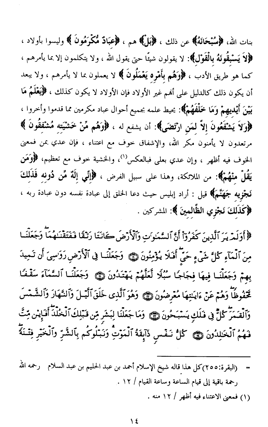 بنات الله، (سُبْحَانَهُ) عن ذلك، (بَلْ) هم، (عِبَادٌ مكْرَمُونَ) وليسوا بأولاد، (لَا يَسْبِقُونَهُ بِالْقَوْلِ): لا يقولون شيئًا حتى يقول الله، ولا يتكلمون إلا بما يأمرهم، كما هو طريق الأدب، (وَهُم بِأَمرِهِ يَعْمَلُونَ) لا يعملون بما لا يأمرهم، ولا يبعد أن يكون ذلك كالدليل على أنَّهم غير الأولاد فإن الأولاد لا يكون كذلك، (يَعْلَمُ مَا بَيْنَ أَيْدِيهِمْ وَمَا خَلْفَهُمْ): يحيط علمه بجميع أحوال عباد مكرمين مما قدموا وأخروا، (وَلَا يَشْفَعُونَ إِلَّا لِمَنِ ارْتَضَى): أن يشفع له، (وَهُمْ مِنْ خَشْيَتِهِ مُشْفِقُونَ) مرتعدون لا يأمنون مكر الله، والإشفاق خوف مع اعتناء، فإن عدي بمن فمعنى الخوف فيه أظهر، وإن عدي بعلى فبالعكس، والخشية خوف مع تعظيم، (وَمَن يَقُلْ مِنْهُمْ): من الملائكة، وهذا على سبيل الفرض، (إِنِّي إِلَهٌ مِنْ دُونِهِ فَذَلِكَ نَجْزِيهِ جَهَنَّمَ) قيل: أراد إبليس حيث دعا الخلق إلى عبادة نفسه دون عبادة ربه، (كَذَلِكَ نَجْزِي الظَّالِمِينَ): المشركين.