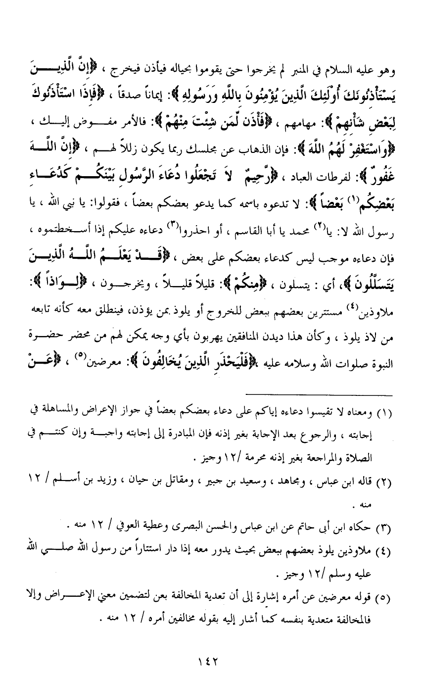 وهو عليه السلام في المنبر لم يخرجوا حتى يقوموا بحياله فيأذن فيخرج، (إِنَّ الَّذِينَ يَسْتَأْذِنُونَكَ أُولَئِكَ الَّذِينَ يُؤْمِنُونَ بِاللهِ وَرَسُولِهِ): إيمانًا صدقًا، (فَإِذَا اسْتَأْذَنُوكَ لِبَعْضِ شَأْنِهِمْ): مهامهم، (فَأْذَنْ لِمَنْ شِئْتَ مِنْهُمْ): فالأمر مفوض إليك، (وَاسْتَغْفِرْ لَهُمُ اللهَ): فإن الذهاب عن مجلسك ربما يكون زللاً لهم، (إِنَّ اللهَ غَفُورٌ): لفرطات العباد، (رَحِيمٌ لَا تَجْعَلُوا دُعَاءَ الرَّسُولِ بَيْنَكُمْ كَدُعَاءِ بَعْضِكُمْ بَعْضًا): لا تدعوه باسمه كما يدعو بعضكم بعضًا، فقولوا: يا نبي الله، يا رسول الله لا: يا محمد يا أبا القاسم، أو احذروا دعاءه عليكم إذا أسخطتموه، فإن دعاءه موجب ليس كدعاء بعضكم على بعض، (قَدْ يَعْلَمُ اللهُ الَّذِينَ يَتَسَلَّلُونَ)، أي: [ينسلون]، (مِنْكُمْ): قليلاً قليلاً، ويخرجون، (لِوَاذًا): ملاوذين مستترين بعضهم ببعض للخروج أو يلوذ بمن يؤذن، فينطلق معه كأنه تابعه من لاذ يلوذ، وكأن هذا ديدن المنافقين يهربون بأي وجه يمكن لهم من محضر حضرة النبوة صلوات الله وسلامه عليه (فَلْيَحْذَرِ الذِينَ يُخَالِفونَ): معرضين، (عَنْ