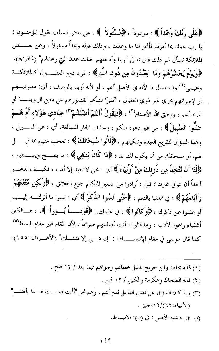 (عَلَى رَبِّكَ وَعْدًا): موعودًا، (مَسْئُولًا): عن بعض السلف يقول المؤمنون: يا رب عملنا بما أمرتنا فأنجز لنا ما وعدتنا، وذلك قوله وعدًا مسئولاً، وعن بعض الملائكة تسأل لهم ذلك قال تعالى (رَبَّنَا وَأَدْخِلْهُمْ جَنَّاتِ عَدْنٍ الَّتِي وَعَدْتَهُمْ) [غافر: 8]، (وَيَوْمَ يَحْشُرُهُمْ وَمَا يَعْبُدُونَ مِنْ دُونِ اللهِ): المراد ذوو العقول كالملائكة وعيسى واستعمال ما لأنه في الأصل أعم، أو لأنه أريد بالوصف، أي: معبوديهم أو لإجرائهم مجرى غير ذوى العقول، تحقيرًا لشأنهم لقصورهم عن معنى الربوبية أو المراد أعم، وينطق الله الأصنام، (فَيَقُولُ أَأَنْتُمْ أَضْلَلْتُمْ عِبَادِي هَؤُلَاءِ أَمْ هُمْ ضَلُّوا السَّبِيلَ): من غير دعوة منكم، وحذف الجار للمبالغة، أي: عن السبيل، وهذا السؤال لتقريع العبدة وتبكيتهم، (قَالوا سبحانَكَ): تعجب منهم مما قيل لهم، أو سبحانك من أن يكون لك ندّ، (مَا كَانَ يَنْبَغِي): ما يصح ويستقيم، (لَنَا أَنْ نَتَّخِذَ مِنْ دُونِكَ مِنْ أَوْلِيَاءَ) أي: نحن لا نعبد إلا أنت، فكيف ندعو أحدًا أن يتولى غيرك؟ قيل: أرادوا من ضمير المتكلم جميع الخلائق، (وَلَكِنْ مَتَّعْتَهُمْ وَآبَاءَهُمْ): في الدنيا بالنعم، (حَتَّى نَسُوا الذِّكْرَ) أي: نسوا ما أنزلته إليهم أو غفلوا عن ذكرك، (وَكَانُوا): في علمك، (قَوْمًا بُورًا)،: هالكين أشقياء راعوا الأدب، وما قالوا: أنت أضللتهم صريحًا، لأن المقام غير مقام البسط كما قال موسى في مقام الانبساط: (إِنْ هِيَ إِلَّا فِتْنَتُكَ) [الأعراف: 155].
