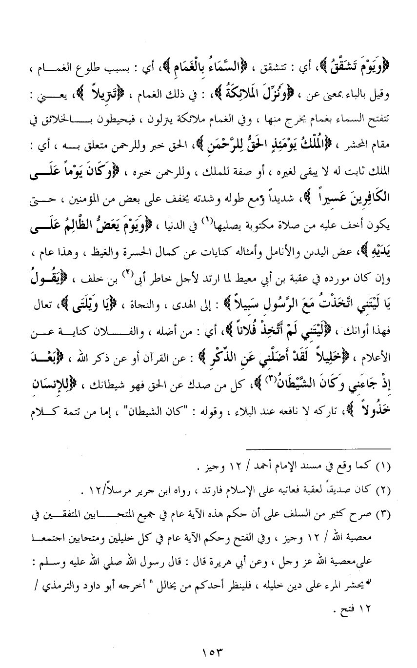 (وَيَوْمَ تَشَقَّقُ)، أي: تتشقق، (السَّمَاءُ بالْغَمَامِ)، أي: بسبب طلوع الغمام، وقيل بالباء بمعنى عن، (وَنُزِّلَ الْمَلَائِكَةُ)، في ذلك الغمام، (تَنْزِيلًا)، يعني: تتفتح السماء بغمام يخرج منها، وفي الغمام ملائكة ينزلون، فيحيطون بالخلائق في مقام المحشر، (الُملْكُ يَوْمَئِد الحَقُّ لِلرَّحْمَنِ)، الحَقُّ خبر ولِلرَّحْمَنِ متعلق به، أي: الملك ثابت له لا يبقى لغيره، أو صفة للملك، وللرحمن خبره، (وَكَانَ يَوْمًا عَلَى الْكَافِرِينَ عَسِيرًا)، شديدًا ومع طوله وشدته يخفف على بعض من المؤمنين، حتى يكون أخف عليه من صلاة مكتوبة يصليها في الدنيا، (وَيَوْمَ يَعَضُّ الظَّالِمُ عَلَى يَدَيْهِ)، عض اليدين والأنامل وأمثاله كنايات عن كمال الحسرة والغيظ، وهذا عام، وإن كان مورده في عقبة بن أبي معيط لما ارتد لأجل خاطر أبي بن خلف، (يَقُولُ يَا لَيْتَنِي اتَّخَذْتُ مَعَ الرَّسُولِ سَبِيلًا): إلى الهدى، والنجاة، (يَا وَيلَتَى)، تعالي فهذا أوانك، (لَيْتَنِي لَمْ أَتَّخِذْ فُلَانًا)، أي: من أضله، والفلان كناية عن الأعلام، (خَلِيلًا لَقَدْ أَضَلَّنِي عَنِ الذِّكْرِ): عن القرآن أو عن ذكر الله، (بَعدَ إِذْ جَاءَنِي وَكَانَ الشَّيْطَانُ)، كل من صدك عن الحق فهو شيطانك، (لِلإِنسَانِ خَذُولاً)، تاركه لا نافعه عند البلاء، وقوله: " كان الشيطان "، إما من تتمة كلام