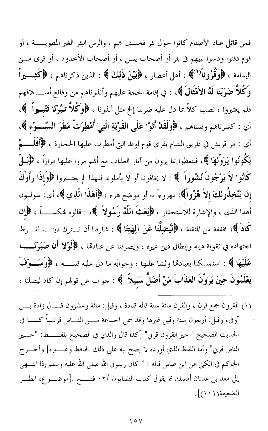 فمن قائل عباد الأصنام كانوا حول بئر فخسف بهم، والرس البئر الغير المطوية، أو قوم دفنوا ودسوا نبيهم في بئر أو أصحاب [يس]، أو أصحاب الأخدود، أو قرى من اليمامة، (وَقُرُونًا)، أهل أعصار، (بَيْنَ ذَلِكَ): الذين ذكرناهم، (كَثِيرًا وَكُلًّا ضَرَبْنَا لَهُ الْأَمْثَالَ)،: في إقامة الحجة عليهم وأنذرناهم من وقائع أسلافهم فلم يعتبروا، نصب (كُلًّا) بما دل عليه ضربنا إلخ مثل أنذرنا، (وَكُلًّا تَبَّرْنَا تَتْبِيرًا)، أي: كسرناهم وفتتناهم، (وَلَقَدْ أَتَوْا عَلَى الْقَرْيَةِ الَّتِي أُمْطِرَتْ مَطَرَ السَّوْءِ)، أي: مر قريش في طريق الشام بقرى قوم لوط التي أمطرت عليها الحجارة، (أَفَلَمْ يَكُونُوا يَرَوْنَهَا)، فيتعظوا بما يرون من آثار العذاب مع أنَّهم مروا عليها مراراَّ، (بَلْ كَانُوا لَا يَرْجُونَ نُشُورًا): لا يخافونه أو لا يأملونه فلهذا لم يعتبروا (وَإِذَا رَأَوْكَ إِنْ يَتَّخِذُونَكَ إِلَّا هُزُوًا): مهزوءاَّ بَه أو موضع هزء، (أَهَذَا الَّذِي)، أي: يقولون أهذا الذي، والإشارة للاستحقار، (بَعَثَ اللهُ رَسُولًا)،: قالوه تهكمًا، (إِنْ كَادَ)، مخففة من المثقلة، (لَيُضِلُّنَا عَنْ آلِهَتِنَا): شارفنا أن نترك ديننا لفرط اجتهاده في تقوية دينه وإبطال دين غيره، ويصرفنا عن عبادتها، (لَوْلَا أَنْ صَبَرْنَا عَلَيْهَا): استمسكنا بعبادتها وثبتنا عليها، وجوابه ما دل عليه قبله، (وَسَوْفَ يَعْلَمُونَ حِينَ يَرَوْنَ الْعَذَابَ مَنْ أَضَلُّ سَبِيلًا): جواب عن قولهم إن كاد ليضلنا،