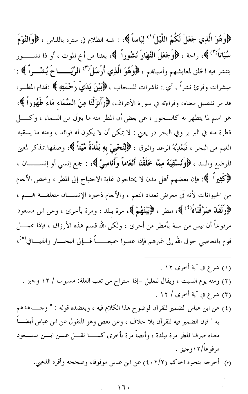 (وَهُوَ الَّذِي جَعَلَ لَكُمُ الليْلَ لِبَاسًا)،: شبه الظلام في ستره باللباس، (وَالنَّوْمَ سُبَاتاً)، راحة، (وَجَعَلَ النَّهَارَ نُشُورًا)، بعثنا من أخ الموت، أو ذا نشور ينتشر فيه الخلق لمعايشهم وأسبابهم، (وَهُوَ الَّذِي أَرْسَلَ الرِّيَاحَ بُشْرًا): مبشرات وقرئ نشرًا، أي: ناشرات للسحاب، (بَيْنَ يَدَيْ رَحْمَتِهِ): قدام المطر، قد مر تفصيل معناه، وقراءته في سورة الأعراف، (وَأَنْزَلْنَا مِنَ السَّمَاءِ مَاءً طَهُورًا)، هو اسم لما يتطهر به كالسحور، عن بعض أن المطر منه ما ينزل من السماء، وكل قطرة منه في البر بر وفي البحر در يعني: لا يمكن أن لا يكون له فوائد، ومنه ما يسقيه الغيم من البحر، فَيَعْذِبُهُ الرعد والبرق، (لِنُحْيِيَ بِهِ بَلْدَةً مَيْتًا)، وصفها بمذكر لمعنى الموضع والبلد، (وَنُسْقِيَهُ مِمَّا خَلَقْنَا أَنْعَامًا وَأَنَاسِيَّ)،: جمع إنسي أو إنسان، (كَثِيرًا): فإن بعضهم أهل مدن لا يحتاجون غاية الاحتياج إلى المطر، وخص الأنعام من الحيوانات لأنه في معرض تعداد النعم، والأنعام ذخيرة الإنسان متعلقة بهم، (وَلَقَدْ صَرَّفْنَاهُ)، المطر، (بَيْنَهُمْ)، مرة ببلد، ومرة بأخرى، وعن ابن مسعود مرفوعًا أن ليس من سنة بأمطر من أخرى، ولكن الله قسم هذه الأرزاق، فإذا عمل قوم بالمعاصي حول الله إلى غيرهم فإذا عصوا جميعًا فإلى البحار والفيافي،
