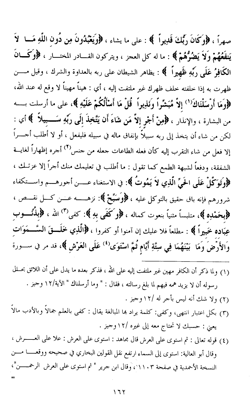 صهرًا، (وَكاَنَ ربُّكَ قَدِيرًا): على ما يشاء، (وَيَعْبُدُونَ مِنْ دُونِ اللهِ مَا لَا يَنْفَعُهُمْ وَلَا يَضُرُّهُمْ): ما له كل العجز، ويتركون القادر المختار، (وَكَانَ الْكَافِرُ عَلَى رَبِّهِ ظَهِيرًا): يظاهر الشيطان على ربه بالعداوة والشرك، وقيل من ظهرت به إذا خلفته خلف ظهرك غير ملتفت إليه، أي: هينًا مهينًا لا وقع له عند الله، (وَمَا أَرْسَلناكَ إِلا مُبَشِّرًا وَنَذِيرًا قُلْ مَا أَسْألكُمْ عَلَيْهِ)، على ما أرسلت به من البشارة، والإنذار، (مِنْ أَجْرٍ إِلا مَن شَاءَ أَن يَتَّخِذَ إِلَى ربِّهِ سَبيلاً) أي: لكن من شاء أن يتخذ إلى ربه سبيلاً بإنفاق ماله في سبيله فليفعل، أو لا أَطلب أجرًا إلا فعل من شاء التقرب إليه كأن فعله الطاعات جعله من جنس أجره إظهارًا لغاية الشفقة، ودفعًا لشبهة الطمع كما تقول: ما أطلب فِي تعليمك منك أجرًا إلا عزتك، (وَتَوَكلْ عَلَى الحَيِّ الذِي لَا يَمُوتُ): في الاستغناء عن أجورهم واستكفاء شرورهم فإنه باق حقيق بالتوكل عليه، (وَسَبِّحْ): نزهه عن كل نقص، (بِحَمْدِهِ)، متلبسًا مثنيًا بنعوت كماله، (وَكَفَى بِهِ): كفى الله، (بِذُنوبِ عِبَادِهِ خَبِيرًا): مطلعًا فلا عليك إن آمنوا أو كفروا، (الَّذِي خَلَقَ السَّمَاوَاتِ وَالْأَرْضَ وَمَا بَيْنَهُمَا فِي سِتَّةِ أَيَّامٍ ثُمَّ اسْتَوَى عَلَى الْعَرْشِ)، قد مر في سورة