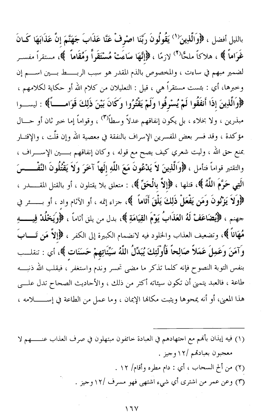 بالليل أفضل، (وَالَّذِينَ يَقُولُونَ رَبَّنَا اصْرِفْ عَنَّا عَذَابَ جَهَنَّمَ إِنَّ عَذَابَهَا كَانَ غَرَامًا)، هلاكًا ملحًّا لازمًا، (إِنَّهَا سَاءَتْ مُسْتَقَرًّا وَمُقَامًا)، مُسْتَقَرًّا مفسر لضمير مبهم في ساءت، والمخصوص بالذم المقدر هو سبب الربط بين اسم إن وخبرها، أي: بئست مُسْتَقَرًّا هي، قيل: التعليلان من كلام الله أو حكاية لكلامهم، (وَالَّذِينَ إِذَا أَنْفَقُوا لَمْ يُسْرِفُوا وَلَمْ يَقْتُرُوا وَكَانَ بَيْنَ ذَلِكَ قَوَامًا): ليسوا مبذرين، ولا بخلاء، بل يكون إنفاقهم عدلاً وسطًا، وقوامًا إما خبر ثان أو حال مؤكدة، وقد فسر بعض المفسرين الإسراف بالنفقة في معصية الله وإن قلَّت، والإقتار بمنع حق الله، وليت شعري كيف يصح مع قوله، وكان إنفاقهم بين الإسراف، والتقتير قوامًا فتأمل، (وَالَّذِينَ لَا يَدْعُونَ مَعَ اللهِ إِلَهًا آخَرَ وَلَا يَقْتُلُونَ النَّفْسَ الَّتِي حَرَّمَ اللهُ)، قتلها، (إِلَّا بِالْحَقِّ)،: متعلق بـ لا يقتلون، أو بالقتل المقدر، (وَلَا يَزْنُونَ وَمَنْ يَفْعَلْ ذَلِكَ يَلْقَ أَثَامًا)، جزاء إثمه، أو الآثام وادٍ، أو بئر في جهنم، (يُضَاعَفْ لَهُ الْعَذَابُ يَوْمَ الْقِيَامَةِ)، بدل من يَلْقَ أَثَامًا، (وَيَخْلُدْ فِيهِ مُهَانًا)، وتضعيف العذاب والخلود فيه لانضمام الكبيرة إلى الكفر، (إِلَّا مَنْ تَابَ وَآمَنَ وَعَمِلَ عَمَلًا صَالِحًا فَأُولَئِكَ يُبَدِّلُ اللهُ سَيِّئَاتِهِمْ حَسَنَاتٍ)، أي: تنقلب بنفس التوبة النصوح فإنه كلما تذكر ما مضى تحسر وندم واستغفر، فيقلب الله ذنبه طاعة، فالعبد يتمني أن تكون سيئاته أكثر من ذلك، والأحاديث الصحاح تدل على هذا المعنى، أو أنه يمحوها ويثبت مكانها الإيمان، وما عمل من الطاعة في إسلامه،