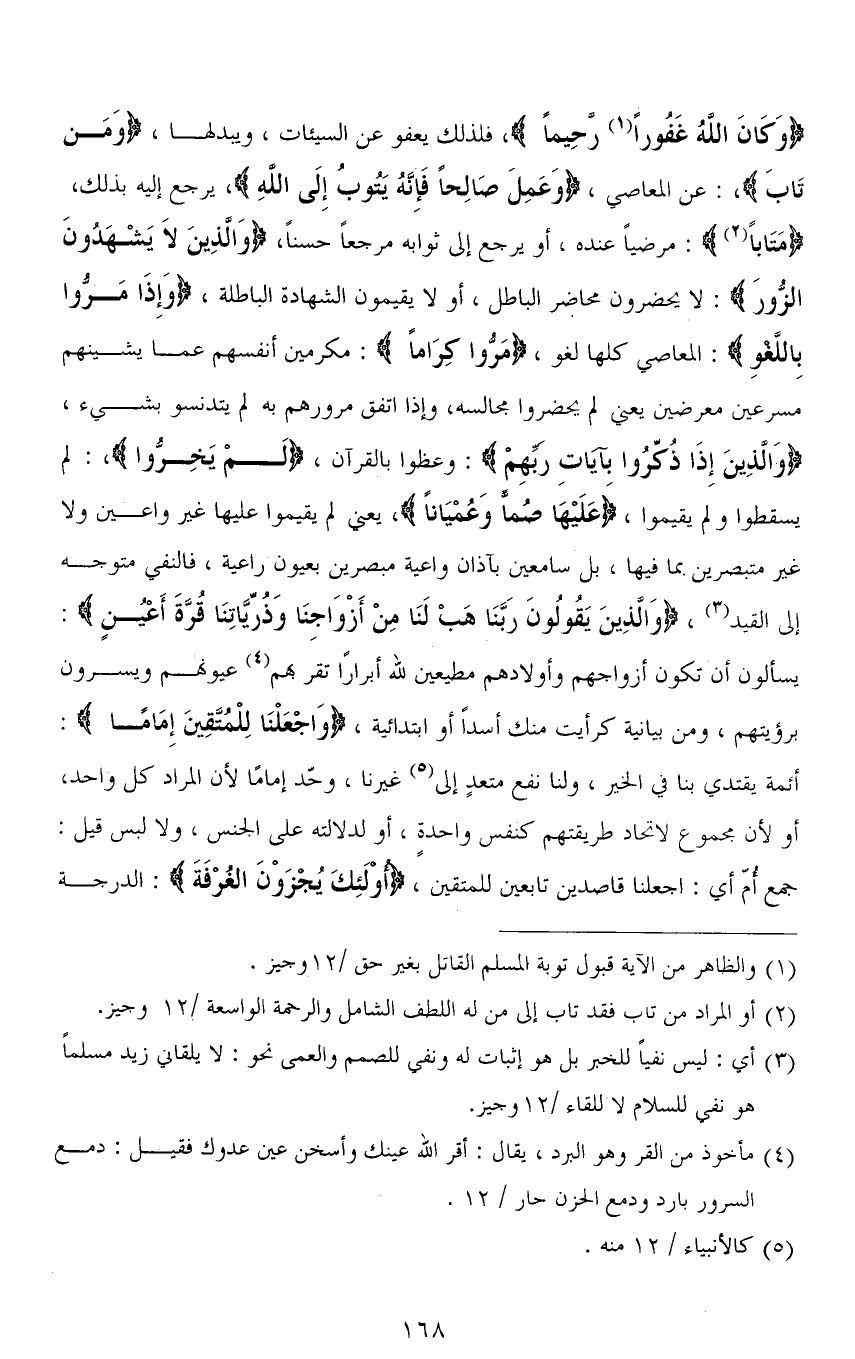 (وَكَانَ اللهُ غفورًا رحِيمًا)، فلذلك يعفو عن السيئات، ويبدلها، (وَمَن تَابَ)،: عن المعاصي، (وَعَمِلَ صَالِحًا فَإِنَّهُ يَتُوبُ إِلَى اللهِ)، يرجع إليه بذلك، (مَتَابًا): مرضيًا عنده، أو يرجع إلى ثوابه مرجعًا حسنًا، (وَالَّذِينَ لَا يَشْهَدُونَ الزُّورَ): لا يحضرون محاضر الباطل، أو لا يقيمون الشهادة الباطلة، (وَإِذَا مَرُّوا بِاللَّغْوِ): المعاصي كلها لغو، (مَرُّوا كِرَامًا): مكرمين أنفسهم عما يشينهم مسرعين معرضين يعني لم يحضروا مجالسه، وإذا اتفق مرورهم به لم يتدنسوا بشيء، (وَالَّذِينَ إِذَا ذُكِّرُوا بِآيَاتِ رَبِّهِمْ): وعظوا بالقرآن، (لَمْ يَخِرُّوا): لم يسقطوا ولم يقيموا، (عَلَيْهَا صُمًّا وَعُمْيَانًا)، يعني لم يقيموا عليها غير واعين ولا غير متبصرين بما فيها، بل سامعين بآذان واعية مبصرين بعيون راعية، فالنفي متوجه إلى القيد، (وَالَّذِينَ يَقُولُونَ رَبَّنَا هَبْ لَنَا مِنْ أَزْوَاجِنَا وَذُرِّيَّاتِنَا قُرَّةَ أَعْيُنٍ): يسألون أن تكون أزواجهم وأولادهم مطيعين لله أبرارا تقرُّ بهم عيونهم ويسرون برؤيتهم، ومن بيانية كرأيت منك أسدًا أو ابتدائية، (وَاجْعَلْنَا لِلْمُتَّقِينَ إِمَامًا): أئمة يقتدي بنا في الخير، ولنا نفع متعدٍ إلى غيرنا، وُحِّد إمامًا لأن المراد كل واحد، أو [لأنه] مجموع لاتحاد طريقتهم كنفس واحدة، أو لدلالته على الجنس، ولا لبس [وقيل جمع آم كصائم وصيام] (1) أي: اجعلنا قاصدين تابعين للمتقين، (أُولَئِكَ يُجْزَوْنَ الْغُرْفَةَ): الدرجة