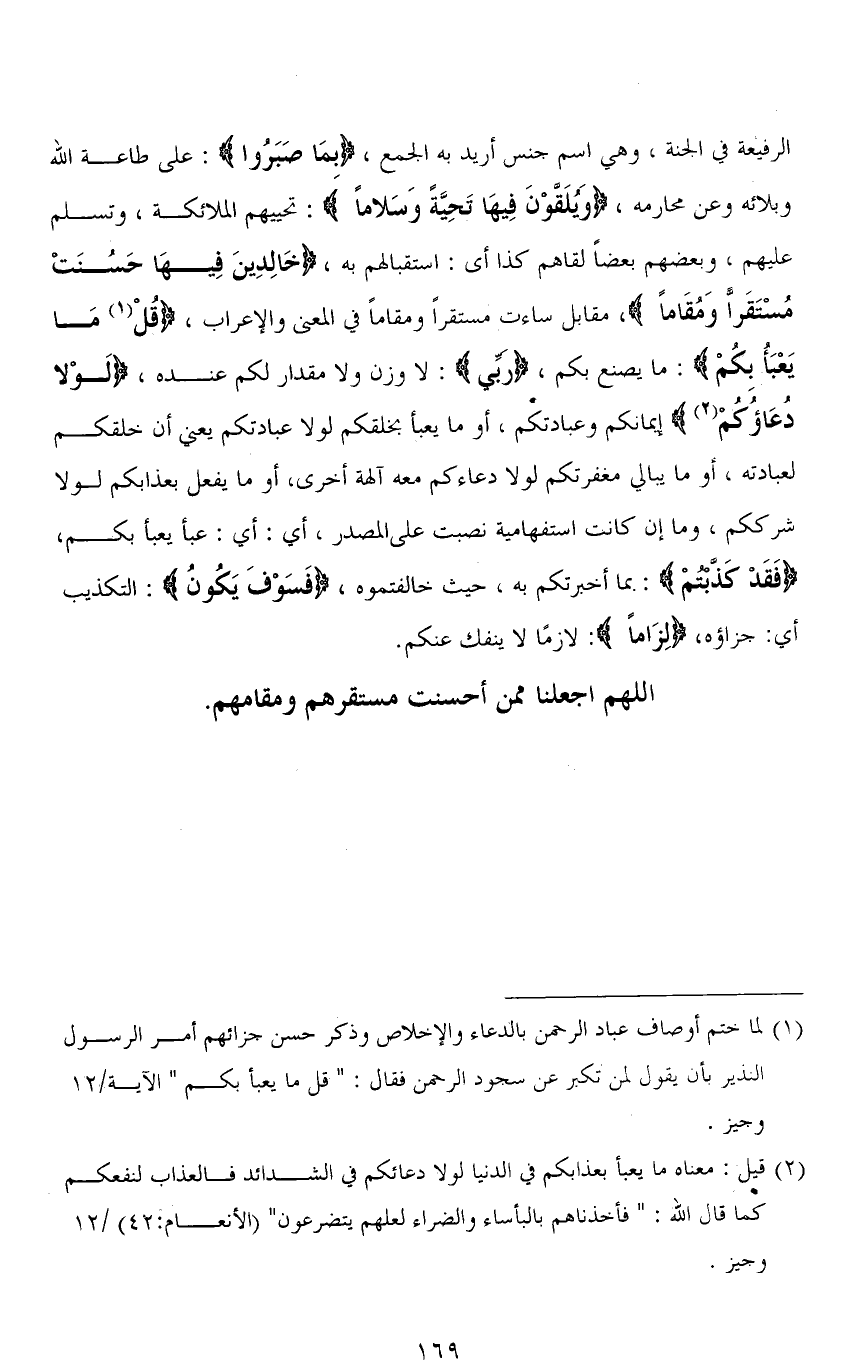 الرفيعة في الجنة، وهي اسم جنس أريد به الجمع، (بمَا صَبَرُوا): على طاعة الله وبلائه وعن محارمه، (وَيُلَقَّوْنَ فِيهَا تَحِيَّةً وَسَلَامًا): تحييهم الملائكة، وتسلم عليهم، وبعضهم بعضًا لقاهم كذا أي: استقبالهم به، (خَالِدِينَ فِيهَا حَسُنَتْ مُسْتَقَرًّا وَمُقَامًا)، مقابل ساءت مُسْتَقَرًّا ومقامًا في المعنى والإعراب، (قُلْ مَا يَعْبَأُ بِكُمْ): ما يصنع بكم، (ربي): لا وزن ولا مقدار لكم عنده، (لَوْلا دُعَاؤُكُمْ) إيمانكم وعبادتكم، أو ما يعبأ بخلقكم لولا عبادتكم يعني أن خلقكم لعبادته، أو ما يبالي مغفرتكم لولا دعاءكم معه آلهة أخرى، أو ما يفعل بعذابكم لولا شرككم، وما إن كانت استفهامية نصبت على المصدر، أي: أيُّ: عبأ يعبأ بكم، (فَقَدْ كَذَّبْتُمْ): بما أخبرتكم به، حيث خالفتموه، (فَسَوْفَ يَكُونُ): التكذيب أي: جزاؤه، (لِزَامًا): لازمًا لا ينفك عنكم.