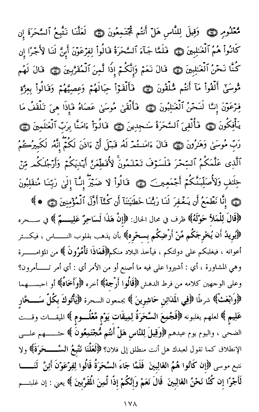 (قَالَ لِلْمَلَإِ حَوْلَهُ) ظرف في محال الحال: (إِنَّ هَذَا لَسَاحِرٌ عَلِيمٌ) في سحره (يُرِيدُ أَن يُخْرِجَكُم مَنْ أَرْضِكُم بِسِحْرِهِ) بأن يذهب بقلوب الناس، فيكثر أعوانه، فيغلبكم على دولتكم، فيأخذ البلاد منكم (فَمَاذَا تَأْمُرُونَ) من المؤامرة وهى المشاورة، أي: أشيروا عليَّ فيه ما أصنع أو من الأمر أي: أي أمر تأمرون؟ وعلى الوجهين كلامه من فرط الدهش (قَالُوا أَرْجِهْ) أخِّره (وَأَخَاهُ) أو احبسهما (وَابْعَثْ) شرطًا (فِي المَدَائِنِ حَاشِرِينَ) يجمعون السحرة (يَأْتُوكَ بِكُلِّ سَحَّارٍ عَلِيمٍ) لعلهم يغلبونه (فَجُمِعَ السَّحَرَةُ لِمِيقَاتِ يَوْمٍ مَعْلُومٍ) الميقات وقت الضحى، واليوم يوم عيدهم (وَقِيلَ لِلنَّاسِ هَلْ أَنْتُمْ مُجْتَمِعُونَ) حثهم على الانطلاق كما تقول لعبدك هل أنت منطلق إلى فلان؟ (لَعَلَّنَا نَتَّبِعُ السَّحَرَةَ) ولا نتبع موسى (إِنْ كَانُوا هُمُ الْغَالِبِينَ فَلَمَّا جَاءَ السَّحَرَةُ قَالُوا لِفِرْعَوْنَ أَئِنَّ لَنَا لَأَجْرًا إِنْ كُنَّا نَحْنُ الْغَالِبِينَ قَالَ نَعَمْ وَإِنَّكُمْ إِذًا لَمِنَ الْمُقَرَّبِينَ) يعني: إن غلبتم