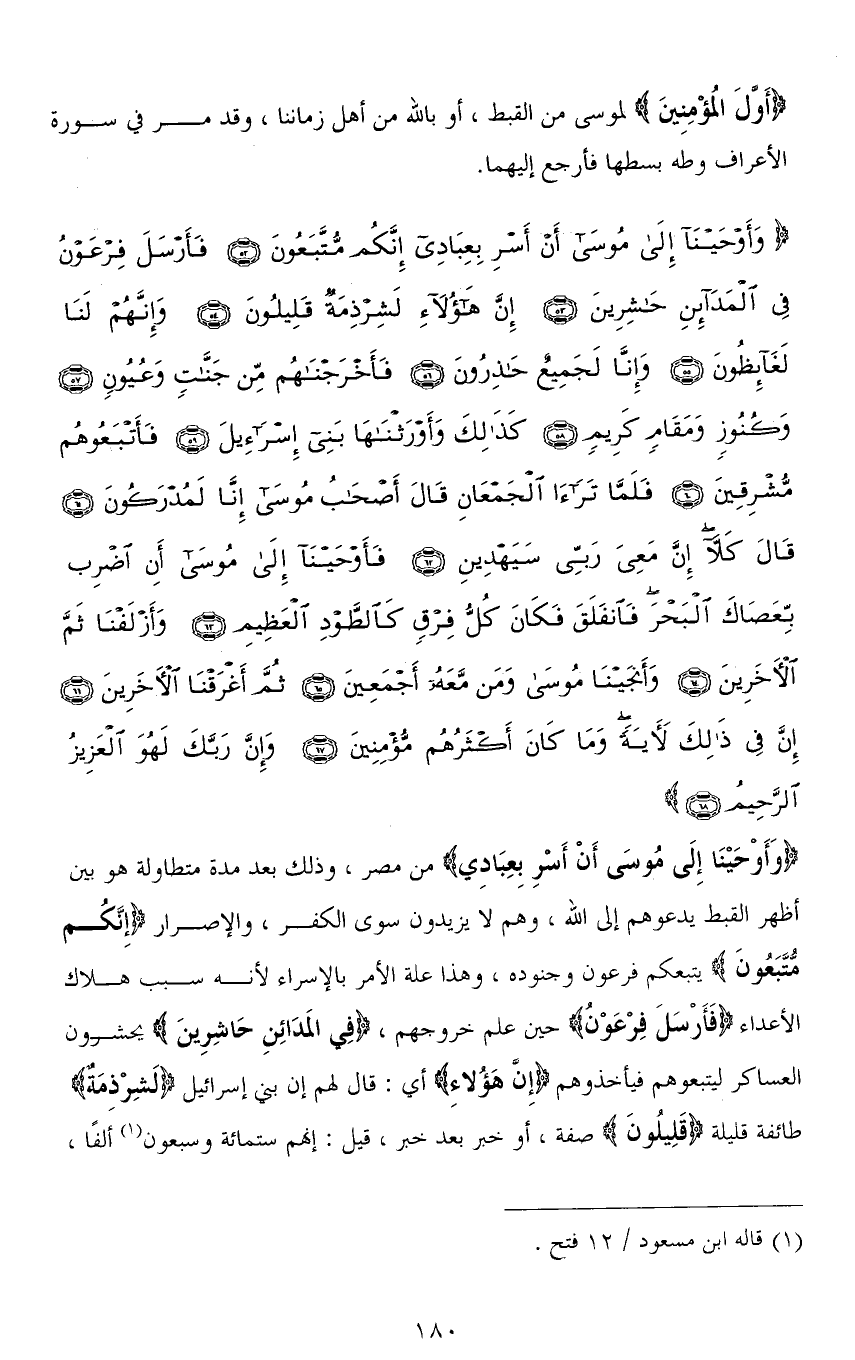 (وَأَوْحَيْنَا إِلَى مُوسَى أَنْ أَسْرِ بِعِبَادِي إِنَّكُمْ مُتَّبَعُونَ (52) فَأَرْسَلَ فِرْعَوْنُ فِي الْمَدَائِنِ حَاشِرِينَ (53) إِنَّ هَؤُلَاءِ لَشِرْذِمَةٌ قَلِيلُونَ (54) وَإِنَّهُمْ لَنَا لَغَائِظُونَ (55) وَإِنَّا لَجَمِيعٌ حَاذِرُونَ (56) فَأَخْرَجْنَاهُمْ مِنْ جَنَّاتٍ وَعُيُونٍ (57) وَكُنُوزٍ وَمَقَامٍ كَرِيمٍ (58) كَذَلِكَ وَأَوْرَثْنَاهَا بَنِي إِسْرَائِيلَ (59) فَأَتْبَعُوهُمْ مُشْرِقِينَ (60) فَلَمَّا تَرَاءَا الْجَمْعَانِ قَالَ أَصْحَابُ مُوسَى إِنَّا لَمُدْرَكُونَ (61) قَالَ كَلَّا إِنَّ مَعِيَ رَبِّي سَيَهْدِينِ (62) فَأَوْحَيْنَا إِلَى مُوسَى أَنِ اضْرِبْ بِعَصَاكَ الْبَحْرَ فَانْفَلَقَ فَكَانَ كُلُّ فِرْقٍ كَالطَّوْدِ الْعَظِيمِ (63) وَأَزْلَفْنَا ثَمَّ الْآخَرِينَ (64) وَأَنْجَيْنَا مُوسَى وَمَنْ مَعَهُ أَجْمَعِينَ (65) ثُمَّ أَغْرَقْنَا الْآخَرِينَ (66) إِنَّ فِي ذَلِكَ لَآيَةً وَمَا كَانَ أَكْثَرُهُمْ مُؤْمِنِينَ (67) وَإِنَّ رَبَّكَ لَهُوَ الْعَزِيزُ الرَّحِيمُ (68)