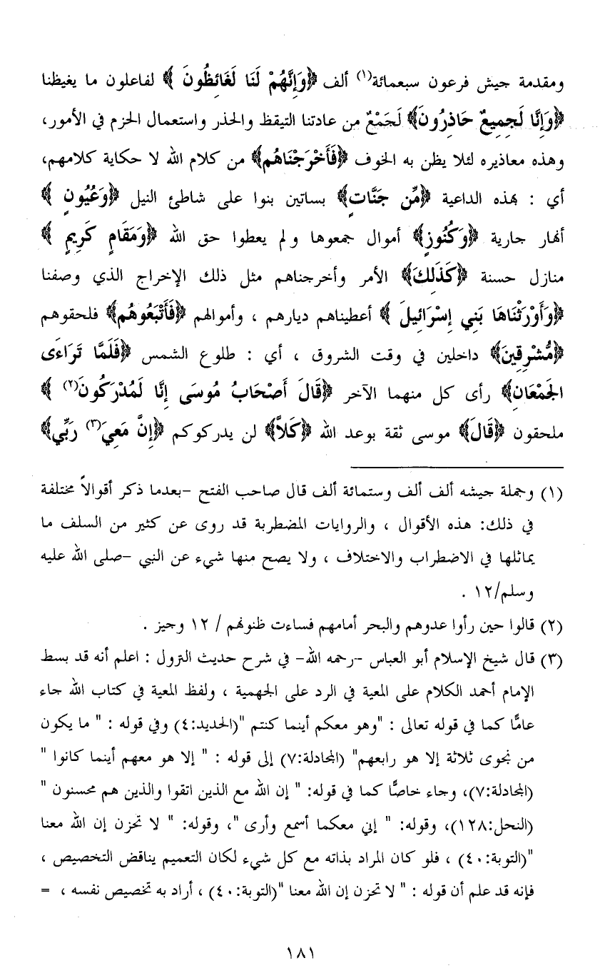 ومقدمة جيش فرعون سبعمائة ألف (وَإِنَّهُمْ لَنَا لَغَائِظُونَ) لفاعلون ما يغيظنا (وَإِنَّا لَجَمِيعٌ حَاذِرُونَ) لَجَمْعٌ من عادتنا التيقظ والحذر واستعمال الحزم في الأمور، وهذه معاذيره لئلا يظن به الخوف (فَأَخْرَجْنَاهُمْ) من كلام الله لا حكاية كلامهم، أي: بهذه الداعية (مِنْ جَنَّاتٍ) بساتين بنوا على شاطئ النيل (وَعُيُونٍ) أنهار جارية (وَكُنُوزٍ) أموال جمعوها ولم يعطوا حق الله (وَمَقَامٍ كَرِيمٍ) منازل حسنة (كَذَلِكَ) الأمر وأخرجناهم مثل ذلك الإخراج الذي وصفنا (وَأَوْرَثْنَاهَا بَنِي إِسْرَائِيلَ) أعطيناهم ديارهم، وأموالهم (فَأَتْبَعُوهُمْ) فلحقوهم (مُشْرِقِينَ) داخلين في وقت الشروق، أي: طلوع الشمس (فَلَمَّا تَرَاءَا الْجَمْعَانِ) رأى كل منهما الآخر (قَالَ أَصْحَابُ مُوسَى إِنَّا لَمُدْرَكُونَ) ملحقون (قَالَ) موسى ثقة بوعد الله (كَلَّا) لن يدركوكم (إِنَّ مَعِيَ رَبِّي)
