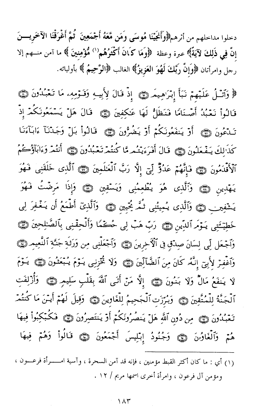 (وَاتْلُ عَلَيْهِمْ نَبَأَ إِبْرَاهِيمَ (69) إِذْ قَالَ لِأَبِيهِ وَقَوْمِهِ مَا تَعْبُدُونَ (70) قَالُوا نَعْبُدُ أَصْنَامًا فَنَظَلُّ لَهَا عَاكِفِينَ (71) قَالَ هَلْ يَسْمَعُونَكُمْ إِذْ تَدْعُونَ (72) أَوْ يَنْفَعُونَكُمْ أَوْ يَضُرُّونَ (73) قَالُوا بَلْ وَجَدْنَا آبَاءَنَا كَذَلِكَ يَفْعَلُونَ (74) قَالَ أَفَرَأَيْتُمْ مَا كُنْتُمْ تَعْبُدُونَ (75) أَنْتُمْ وَآبَاؤُكُمُ الْأَقْدَمُونَ (76) فَإِنَّهُمْ عَدُوٌّ لِي إِلَّا رَبَّ الْعَالَمِينَ (77) الَّذِي خَلَقَنِي فَهُوَ يَهْدِينِ (78) وَالَّذِي هُوَ يُطْعِمُنِي وَيَسْقِينِ (79) وَإِذَا مَرِضْتُ فَهُوَ يَشْفِينِ (80) وَالَّذِي يُمِيتُنِي ثُمَّ يُحْيِينِ (81) وَالَّذِي أَطْمَعُ أَنْ يَغْفِرَ لِي خَطِيئَتِي يَوْمَ الدِّينِ (82) رَبِّ هَبْ لِي حُكْمًا وَأَلْحِقْنِي بِالصَّالِحِينَ (83) وَاجْعَلْ لِي لِسَانَ صِدْقٍ فِي الْآخِرِينَ (84) وَاجْعَلْنِي مِنْ وَرَثَةِ جَنَّةِ النَّعِيمِ (85) وَاغْفِرْ لِأَبِي إِنَّهُ كَانَ مِنَ الضَّالِّينَ (86) وَلَا تُخْزِنِي يَوْمَ يُبْعَثُونَ (87) يَوْمَ لَا يَنْفَعُ مَالٌ وَلَا بَنُونَ (88) إِلَّا مَنْ أَتَى اللهَ بِقَلْبٍ سَلِيمٍ (89) وَأُزْلِفَتِ الْجَنَّةُ لِلْمُتَّقِينَ (90) وَبُرِّزَتِ الْجَحِيمُ لِلْغَاوِينَ (91) وَقِيلَ لَهُمْ أَيْنَ مَا كُنْتُمْ تَعْبُدُونَ (92) مِنْ دُونِ اللهِ هَلْ يَنْصُرُونَكُمْ أَوْ يَنْتَصِرُونَ (93) فَكُبْكِبُوا فِيهَا هُمْ وَالْغَاوُونَ (94) وَجُنُودُ إِبْلِيسَ أَجْمَعُونَ (95) قَالُوا وَهُمْ فِيهَا