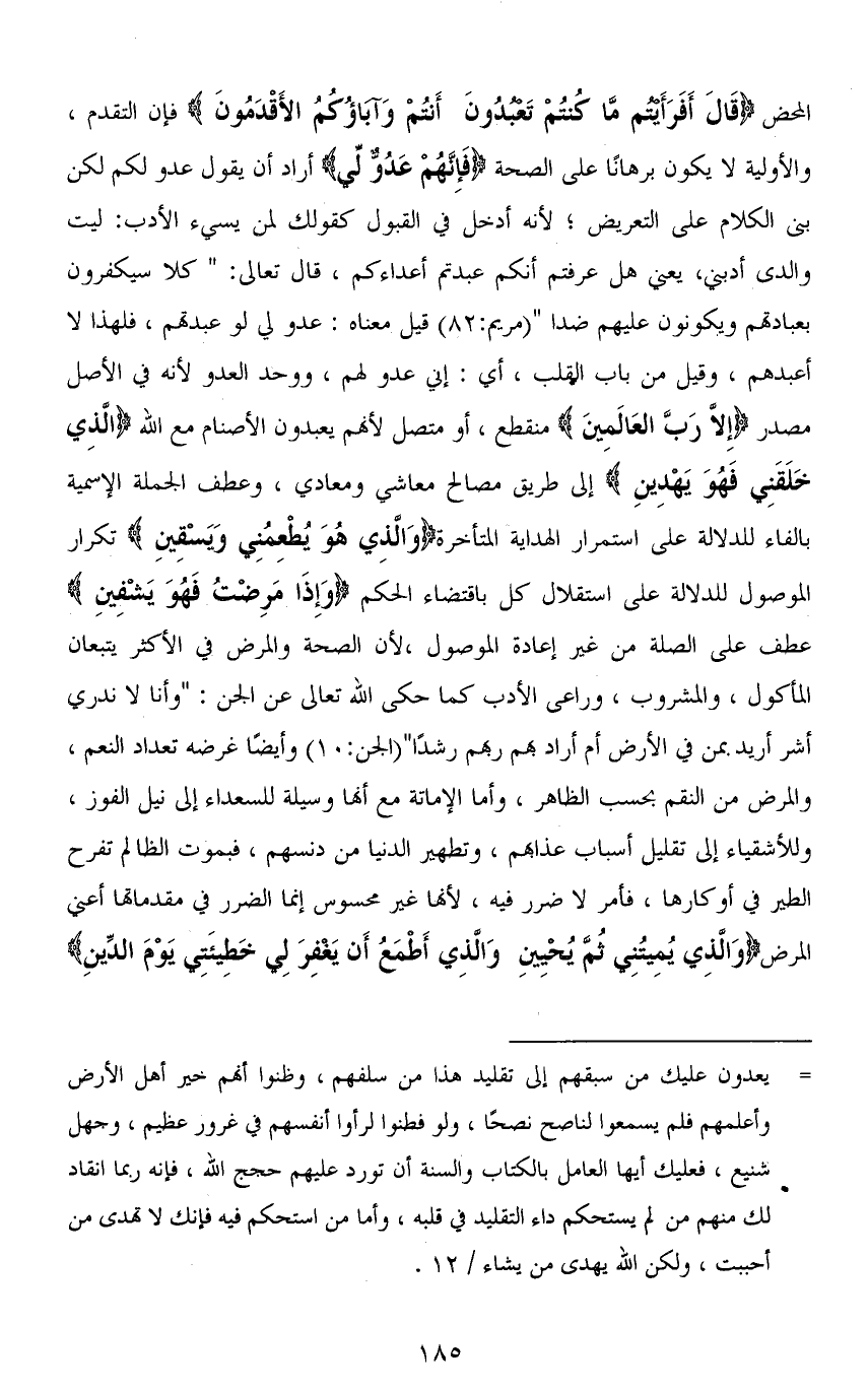 المحض (قَالَ أَفَرَأَيْتُمْ مَا كُنْتُمْ تَعْبُدُونَ أَنْتُمْ وَآبَاؤُكُمُ الْأَقْدَمُونَ) فإن التقدم، والأولية لا يكون برهانًا على الصحة (فَإِنَّهُمْ عَدُوٌّ لِي) أراد أن يقول عدو لكم لكن بنى الكلام على التعريض، لأنه أدخل في القبول كقولك لمن يسيء الأدب: ليت والدي أدبني، يعني هل عرفتم أنكم عبدتم أعداءكم، قال تعالى: " كلا سيكفرون بعبادتهم ويكونون عليهم ضدا " [مريم: 82] قيل معناه: عدو لي لو عبدتهم، فلهذا لا أعبدهم، وقيل من باب القلب، أي: إني عدو لهم، ووحد العدو لأنه في الأصل مصدر (إِلَّا رَبَّ الْعَالَمِينَ) منقطع، أو متصل لأنَّهُم يعبدون الأصنام مع الله (الذِي خَلَقَنِي فَهُوَ يَهْدِينِ) إلى طريق مصالح معاشي ومعادي، وعطف الجملة الاسمية بالفاء للدلالة على استمرار الهداية المتأخرة (وَالَّذِي هُوَ يُطْعِمُنِي وَيَسْقِينِ) تكرار الموصول للدلالة على استقلال كل باقتضاء الحكم (وَإِذَا مَرِضْتُ فَهُوَ يَشْفِينِ) عطف على الصلة من غير إعادة الموصول، لأن الصحة والمرض في الأكثر يتبعان المأكول، والمشروب، وراعى الأدب كما حكى الله تعالى عن الجن: (وَأَنَّا لَا نَدْرِي أَشَرٌّ أُرِيدَ بِمَنْ فِي الْأَرْضِ أَمْ أَرَادَ بِهِمْ رَبُّهُمْ رَشَدًا) [الجن: 15] وأيضًا غرضه تعداد النعم، والمرض من النقم بحسب الظاهر، وأما الإماتة مع أنها وسيلة للسعداء إلى نيل الفوز، وللأشقياء إلى تقليل أسباب عذابهم، وتطهير الدنيا من دنسهم، فبموت الظالم تفرح الطير في أوكارها، فأمر لا ضرر فيه، لأنها غير محسوس إنما الضرر في مقدماتها أعني المرض (وَالَّذِي يُمِيتُنِي ثُمَّ يُحْيِينِ (81) وَالَّذِي أَطْمَعُ أَنْ يَغْفِرَ لِي خَطِيئَتِي يَوْمَ الدِّينِ)