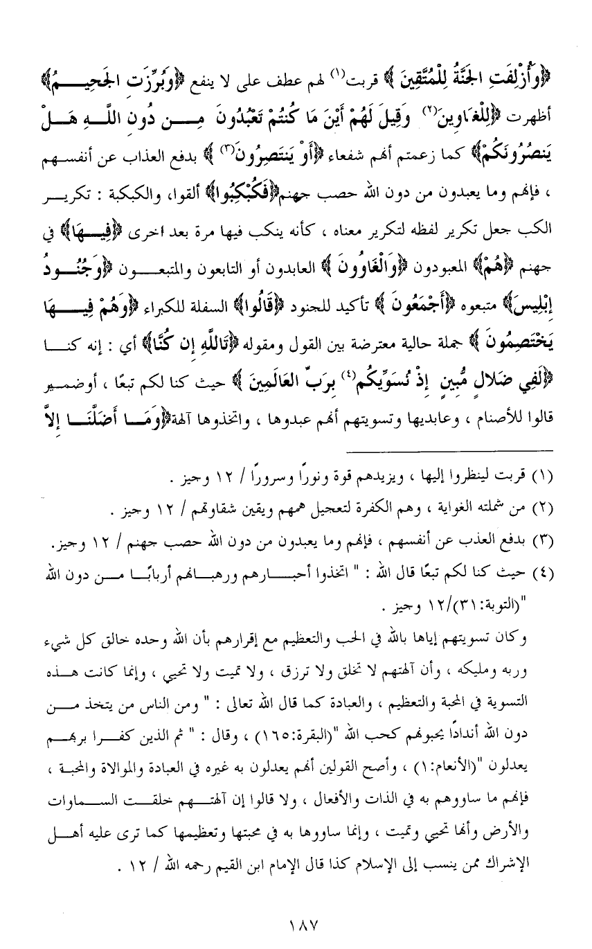 (وَأُزْلِفَتِ الْجَنَّةُ لِلْمُتَّقِينَ) قربت لهم عطف على لا ينفع (وَبُرِّزَتِ الْجَحِيمُ) أظهرت (لِلْغَاوِينَ وَقِيلَ لَهُمْ أَيْنَ مَا كُنْتُمْ تَعْبُدُونَ مِنْ دُونِ اللهِ هَلْ يَنْصُرُونَكُمْ) كما زعمتم أنَّهم شفعاء (أَوْ يَنْتَصِرُونَ) بدفع العذاب عن أنفسهم، فإنهم وما يعبدون من دون الله حصب جهنم (فَكُبْكِبُوا) ألقوا، والكبكبة: تكرير الكب جعل تكرير لفظه لتكرير معناه، كأنه ينكب فيها مرة بعد أخرى (فِيهَا) في جهنم (هُمْ) المعبودون (وَالْغَاوُونَ) العابدون أو التابعون والمتبعون (وَجُنُودُ إِبْلِيسَ) مبعوه (أَجْمَعُونَ) تأكيد للجنود (قَالُوا) السفلة للكبراء (وَهُمْ فِيهَا يَختصِمُون) جملة حالية معترضة بين القول ومقوله (تَاللهِ إِنْ كُنَّا) أي. إنه كنا (لَفِي ضَلَالٍ مُبِينٍ إِذْ نُسَوِّيكُمْ بِرَبِّ الْعَالَمِينَ) حيثُ كنا لكم تبعًا، أو ضمير قالوا للأصنام، وعابديها وتسويتهم أنَّهم عبدوها، واتخذوها آلهة (وَمَا أَضَلَّنَا إِلَّا