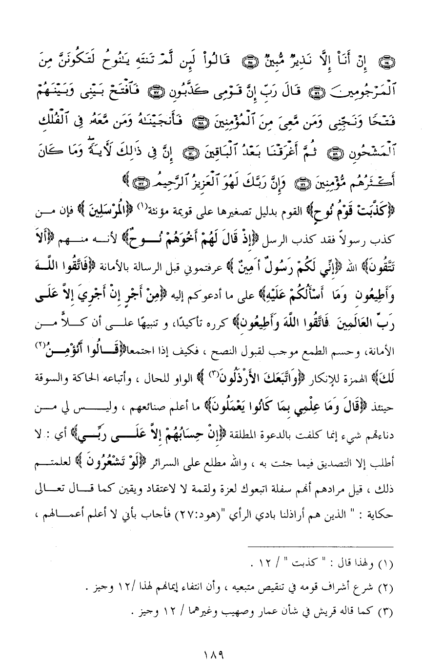 (كَذَّبَتْ قَوْمُ نُوحٍ) القوم بدليل تصغيرها على قويمة مؤنثة (الْمُرْسَلِينَ) فإن من كذب رسولاً فقد كذب الرسل (إِذْ قَالَ لَهُمْ أَخُوهُمْ نُوحٌ) لأنه منهم (أَلَا تَتَّقُونَ) الله (إِنِّي لَكُمْ رَسُولٌ أَمِينٌ) عرفتموني قبل الرسالة بالأمانة (فَاتَّقُوا اللهَ وَأَطِيعُونِ وَمَا أَسْأَلُكُمْ عَلَيْهِ) على ما أدعوكم إليه (مِنْ أَجْرٍ إِنْ أَجْرِيَ إِلَّا عَلَى رَبِّ الْعَالَمِينَ (فَاتَّقُوا اللهَ وَأَطِيعُونِ) كرره تأكيدًا، وتنبيهًا على أن كلاًّ من الأمانة، وحسم الطمع موجب لقبول النصح، فكيف إذا اجتمعا (قَالُوا أَنُؤْمِنُ لَكَ) الهمزة دلإنكار (وَاتَّبَعَكَ الْأَرْذَلُونَ) الواو للحال، وأتباعه الحاكة والسوقة حينئذ (قَالَ وَمَا عِلْمِي بِمَا كَانُوا يَعْمَلُونَ) ما أعلم صنائعهم، وليس لي من دناءتهم شيء إنما كلفت بالدعوة المطلقة (إِنْ حِسَابُهُمْ إِلَّا عَلَى رَبِّي) أي: لا أطلب إلا التصديق فيما جئت به، والله مطلع على السرائر (لَوْ تَشْعُرُونَ) لعلمتم ذلك، قيل مرادهم أنَّهم سفلة اتبعوك لعزة ولقمة لا لاعتقاد ويقين كما قال تعالى حكاية: (الَّذِينَ هُمْ أَرَاذِلُنَا بَادِيَ الرَّأْيِ) [هود: 27] فأجاب بأني لا أعلم أعمالهم،