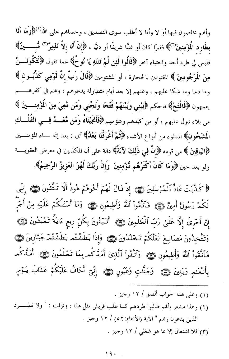 (كَذَّبَتْ عَادٌ الْمُرْسَلِينَ (123) إِذْ قَالَ لَهُمْ أَخُوهُمْ هُودٌ أَلَا تَتَّقُونَ (124) إِنِّي لَكُمْ رَسُولٌ أَمِينٌ (125) فَاتَّقُوا اللهَ وَأَطِيعُونِ (126) وَمَا أَسْأَلُكُمْ عَلَيْهِ مِنْ أَجْرٍ إِنْ أَجْرِيَ إِلَّا عَلَى رَبِّ الْعَالَمِينَ (127) أَتَبْنُونَ بِكُلِّ رِيعٍ آيَةً تَعْبَثُونَ (128) وَتَتَّخِذُونَ مَصَانِعَ لَعَلَّكُمْ تَخْلُدُونَ (129) وَإِذَا بَطَشْتُمْ بَطَشْتُمْ جَبَّارِينَ (130) فَاتَّقُوا اللهَ وَأَطِيعُونِ (131) وَاتَّقُوا الَّذِي أَمَدَّكُمْ بِمَا تَعْلَمُونَ (132) أَمَدَّكُمْ بِأَنْعَامٍ وَبَنِينَ (133) وَجَنَّاتٍ وَعُيُونٍ (134) إِنِّي أَخَافُ عَلَيْكُمْ عَذَابَ يَوْمٍ