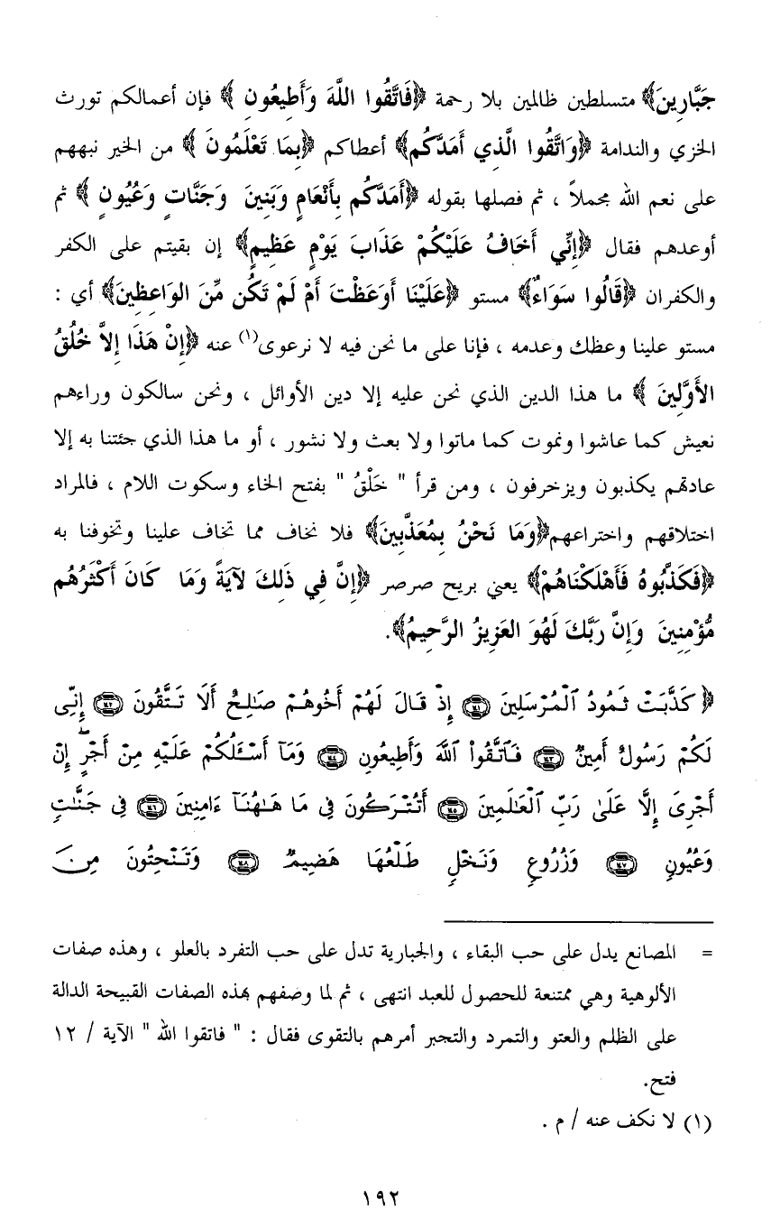 جَبَّارِينَ) متسلطين ظالمين بلا رحمة (فَاتَّقُوا اللهَ وَأَطِيعُونِ) فإن أعمالكم تورث الخزي والندامة (وَاتَّقُوا الَّذِي أَمَدَّكُمْ) أعطاكم (بِمَا تَعْلَمُونَ) من الخير نبههم على نعم الله مجملاً، ثم فصلها بقوله (أَمَدَّكُمْ بِأَنْعَامٍ وَبَنِينَ وَجَنَّاتٍ وَعُيُونٍ) ثم أوعدهم فقال (إِنِّي أَخَافُ عَلَيْكُمْ عَذَابَ يَوْمٍ عَظِيمٍ) إن بقيتم على الكفر والكفران (قَالوا سَوَاءٌ) مستو (عَلَيْنَا أَوَعَظْتَ أَمْ لَمْ تَكُنْ مِنَ الْوَاعِظِينَ) أي: مستو علينا وعظك وعدمه، فإنا على ما نحن فيه لا نرعوي عنه (إِنْ هَذَا إِلا خُلُقُ الأَوَّلِينَ) ما هذا الدين الذي نحن عليه إلا دين الأوائل، ونحن سالكون وراءهم نعيش كما عاشوا ونموت كما ماتوا ولا بعث ولا نشور، أو ما هذا الذي جئتنا به إلا عادتهم يكذبون ويزخرفون، ومن قرأ " خَلْقُ " بفتح الخاء وسكوت اللام، فالمراد اختلاقهم واختراعهم (وَمَا نَحْنُ بِمُعَذَّبِينَ) فلا نخاف مما تخاف علينا وتخوفنا به (فَكَذَّبُوهُ فَأَهْلَكْنَاهُمْ) يعني بريح صرصر (إِنَّ فِي ذَلِكَ لَآيَةً وَمَا كَانَ أَكْثَرُهُمْ مُؤْمِنِينَ وَإِنَّ رَبَّكَ لَهُوَ الْعَزِيزُ الرَّحِيمُ).